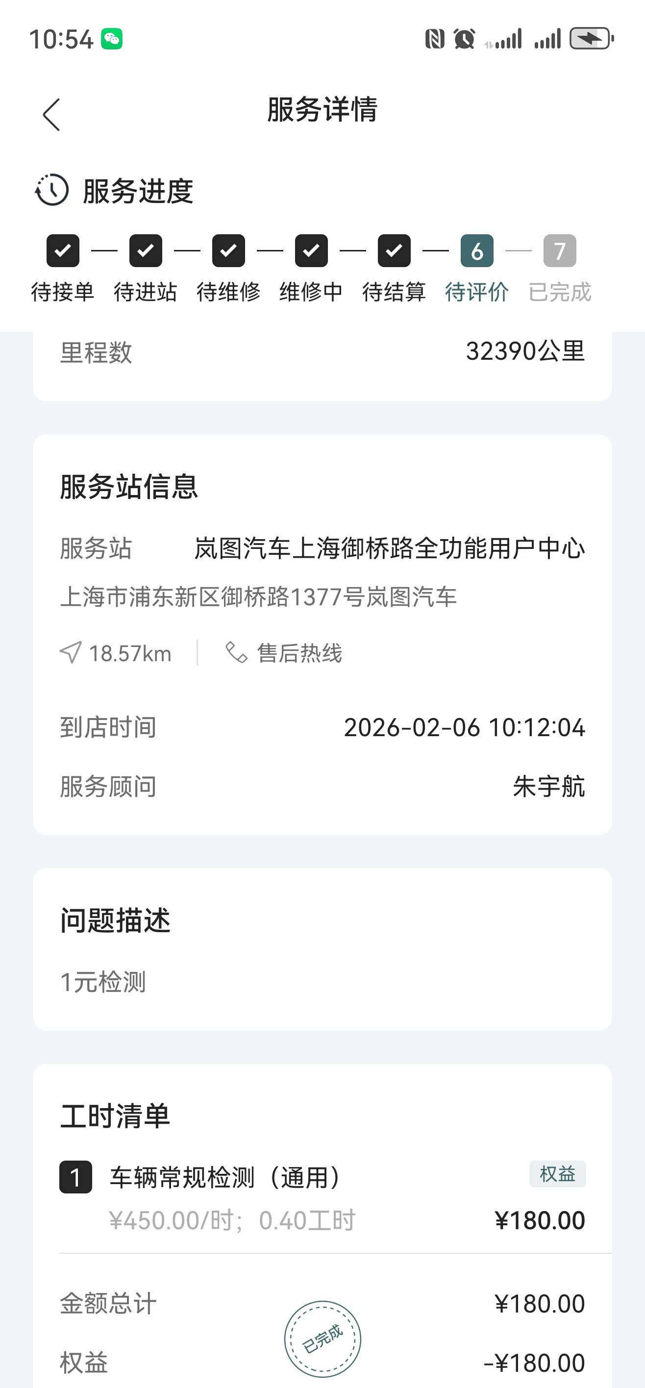 检查全部完成之后,我最关心的就是费用问题。这次我用的是岚图官方春节期间发放的全车免费检测券,提前在APP上领取,到店直接核销使用。售后顾问帮我办理结算的时候,明确告诉我:本次全车安全检查全部免费,不产生任何费用,洗车也是免费安排的,相当于一分钱没花,就给爱车做了一次全面的体检。
