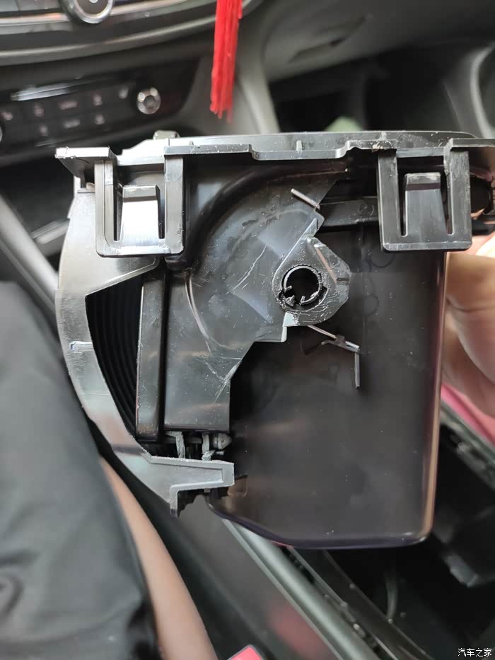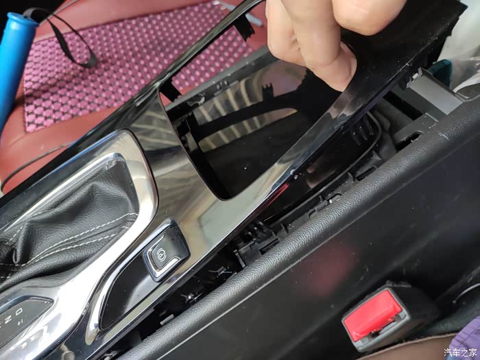 所以琢磨拆排挡面板。这个面板是独立的,用撬棒甚至剪刀,一字螺丝刀都可以,里面都是卡扣。靠近排挡的地方我没有去撬,如图位置已经可以把水杯架取出来了。