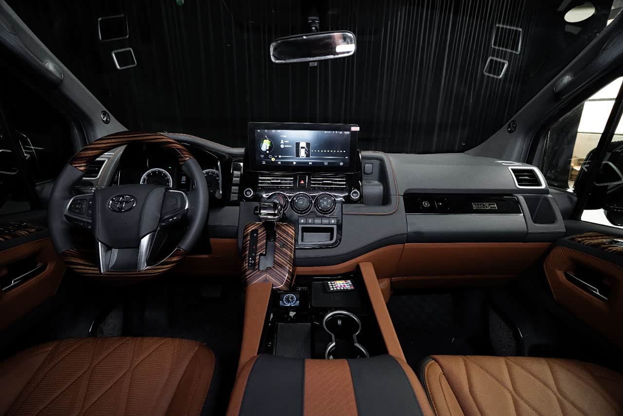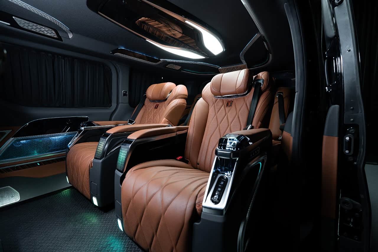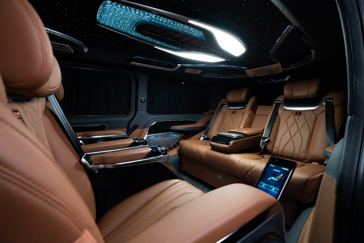 前脸采用 24根镀铬立柱格栅(间距精度±0.1mm),复刻丰田埃尔法霸气造型但更显凌厉;雾灯下移至包围两侧,搭配 冰蓝矩阵激光大灯(照射距离600米),夜间辨识度超400米。高顶车身设计(5350×1958×2060mm)较原车增高70mm,内部净空1.85米,却可自由进出 2.2米限高地库,昆明恒隆广场接驳零压力。