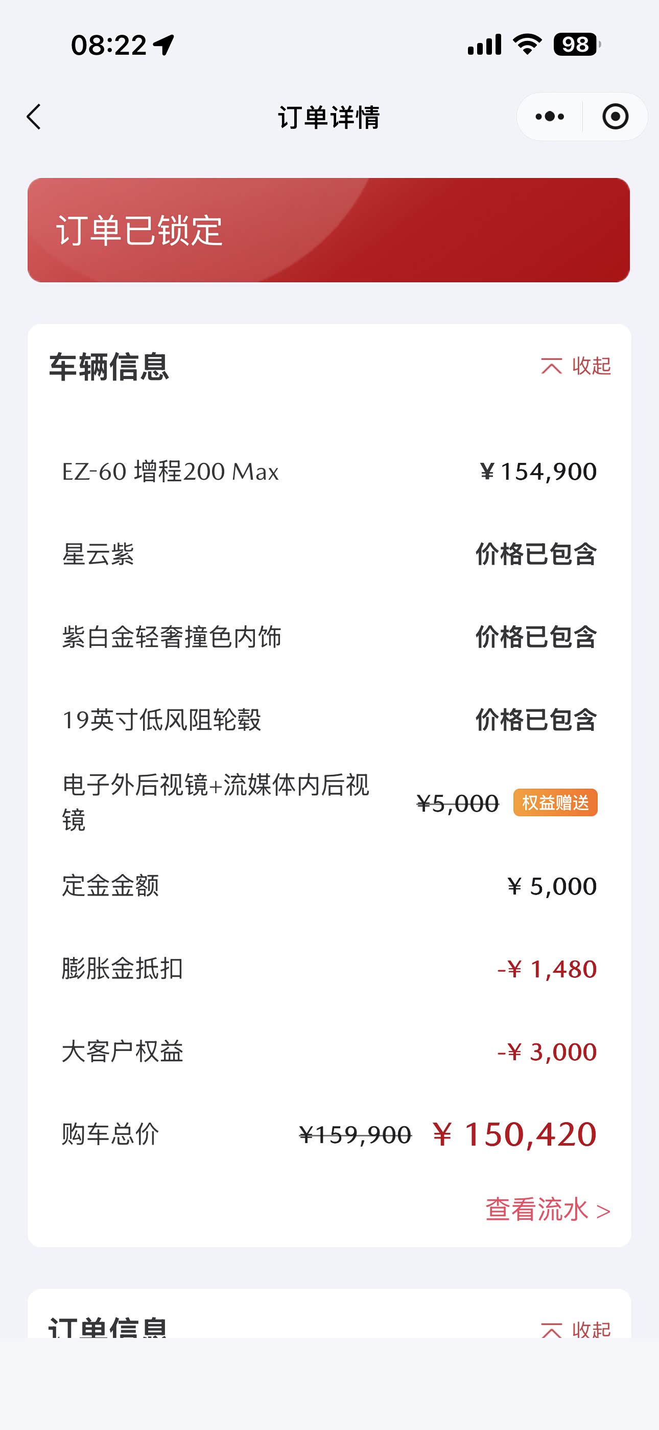 ),期间一直看汽车之家论坛以及看评测,也在汽车之家点了预约试驾(期间收到很多销售打来约我去试驾,因为个人原因一直拖到了9月21日带上了老婆与女儿去试驾)试驾感受给足了我要换车的执念!!!空间大、内饰的26.45英寸悬浮感5K一体式大屏、流媒体后视镜以及内嵌式显示屏、23扬声器+7.1.4杜比全景声、256色氛围灯,9个安全气囊,正副驾零重力座椅、21寸的大轮毂、带遮阳帘的全景天窗、这是我以前开的16款本田凌派所不具备的条件,和老婆对比了小鹏G6,乐道L60、L90(挺好的不过车外观尺寸太大了,小区是老小区没有地库,停车不方便),深蓝S07,零跑C11,前面提到了第一台车是日系的,所以还是比较偏向于买日系的车,最后我和老婆都决定订EZ-60,因为16款的凌派后排空间对于有一个活泼可爱好动的女儿来说是确实是空间紧凑,试驾回家后与老婆商量了选增程还是纯电,因为我妻子不是本地的,每逢放长假都会带老婆回娘家,鉴于高速上的路况,也看到过很多纯电高速上堵车堵到没电,另外女儿也要快6岁了,要出去旅行自驾游,所以最终选择了EZ-60增程200MAX没有里程焦虑,的选配的电子后视镜+流媒体后视镜,下订锁单!!!