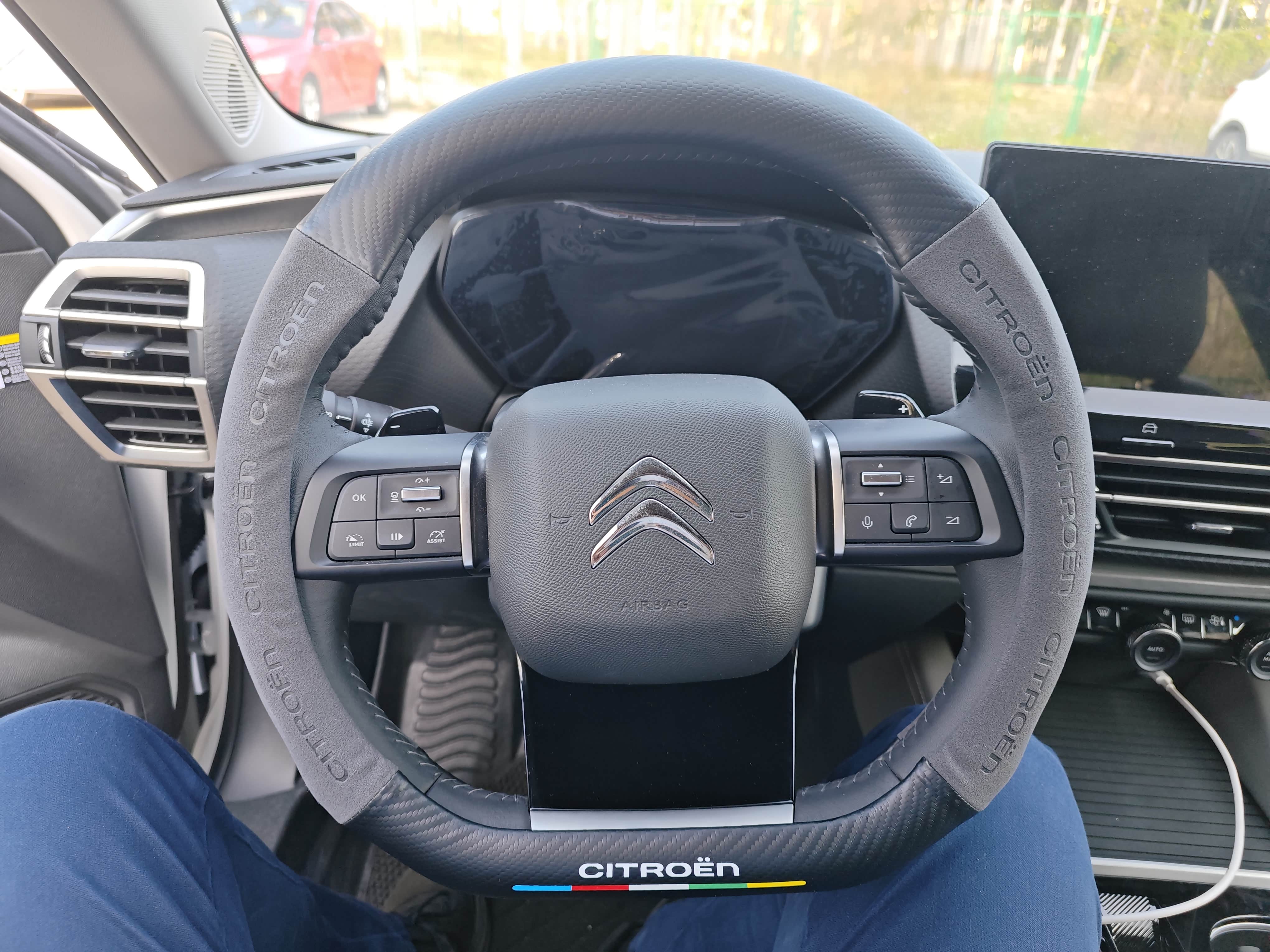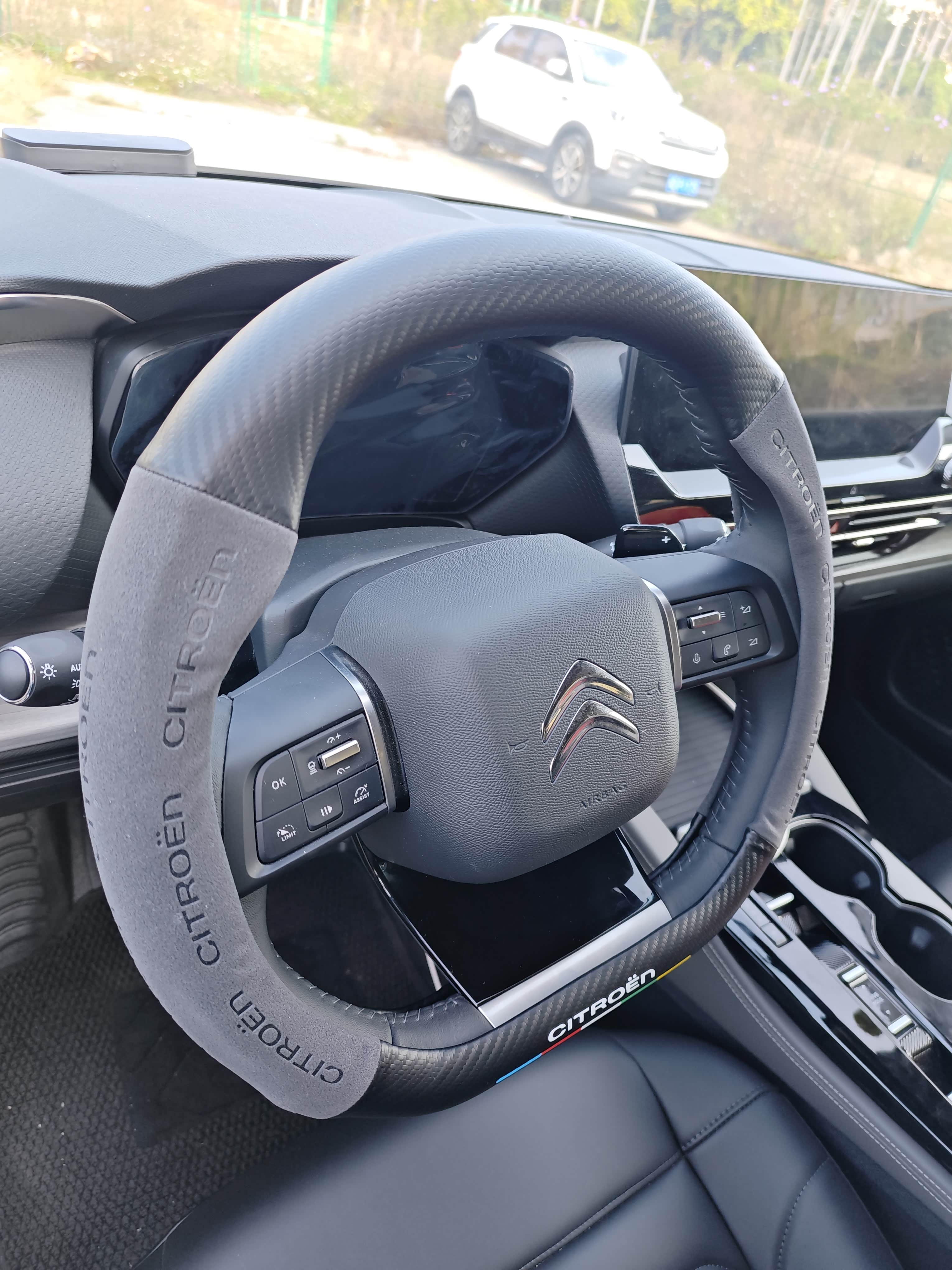 经过多方对比选定了翻毛皮+压印碳纤皮拼接的黑色方向盘套。