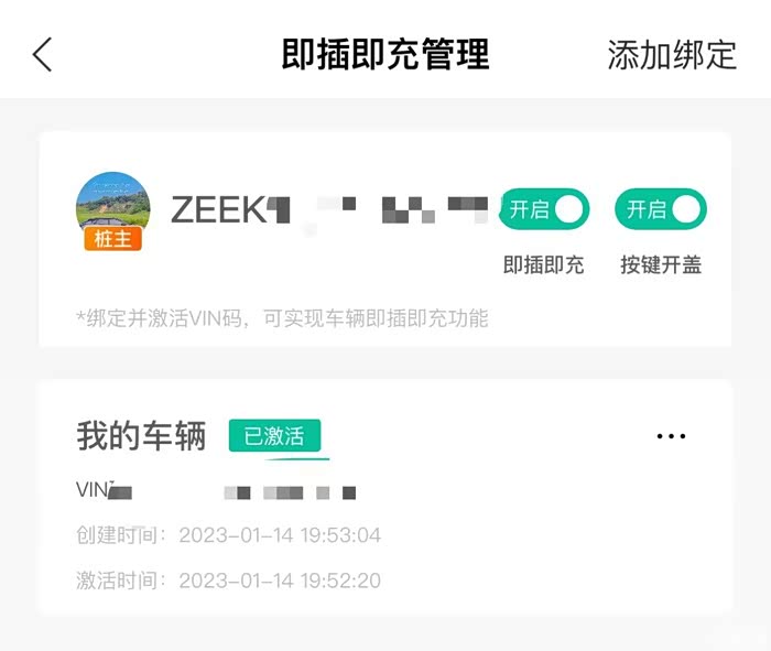 然后在车辆自动识别管理界面右上方,打开《按键开盖》和《即插即充》按钮——绑定成功后车辆自动激活,即可开启即插即充功能——充电完成后需先解锁车辆,然后按住锁止按钮拔出充电枪归位。