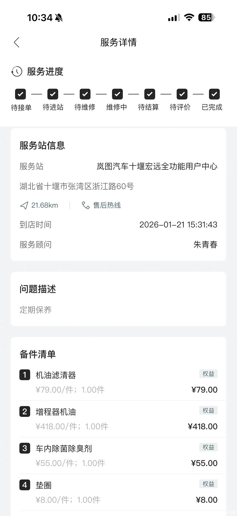 挂电话后我打开岚图APP预约维保,界面清晰显示:虽然增程器里程没到1万,但时间已满一年,需要更换机油、机滤和垫片,总费用680元。幸亏我在他家续保车险时赠送了这次保养权益,所以本次保养费用为0元,这精打细算的快乐谁懂啊!