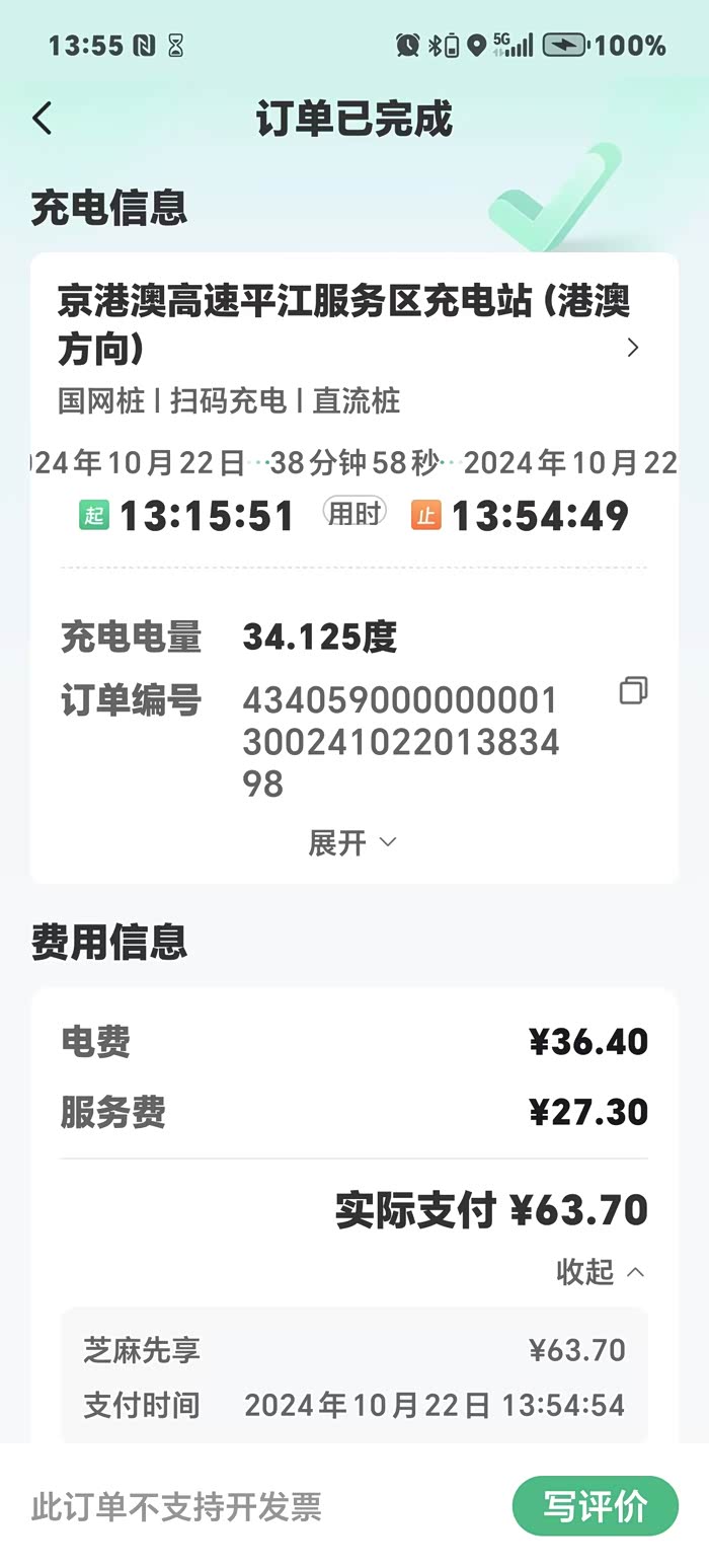 车型是410的探索+,单程205公里,上了高速就是120的跑,空调22度,风速3挡,在高速上超车非常轻松,车辆跑起来也很稳,速度上来了以后,方向盘变硬了,感觉很稳的。在高速上速度上来了掉电快一点,这也算正常,上高速时只有90的续航,开了57公里后进入服务区,当时还剩下19公里续航,续航达成率还是很好的,在服务区充电38分钟到98%,充了34度电,共花了63元,电费36元,服务费27元。在服务区吃个饭时间回到车上就满了,一点不影响。当然这是平时,不需要排队充电,要是假日估计得排队了。