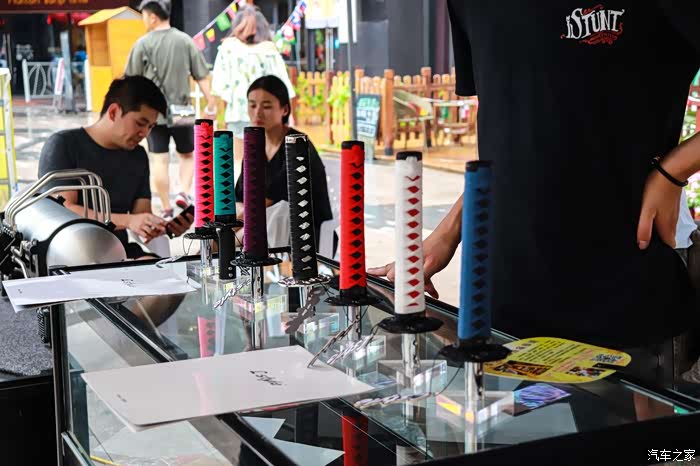 如果你一时兴起突然想给自己的爱车改点什么,这边有一些装饰改件现场出售。就比如这个武士刀的档把。有个性,又容易安装。