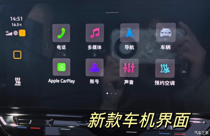 车机:新款对车机升级了。旧款车机的主色调是黄色,而且不能调颜色;新款则采用黑色+彩色的色调,看上去更加的有生活气息,如下: