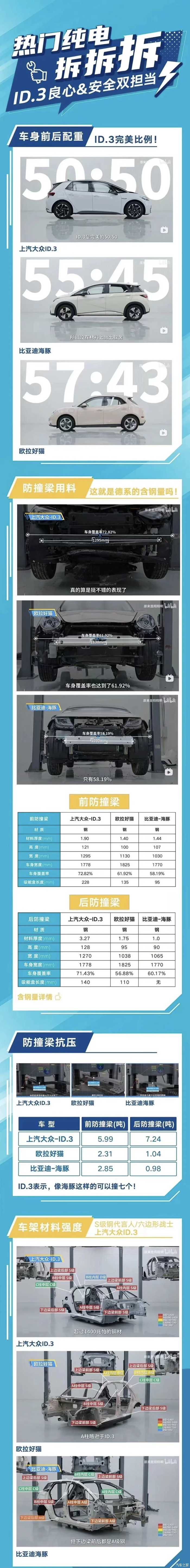 考虑到预算和需求,最终决定在15w以内选择一款纯电车型。网上看了很多网友的帖子,也对比了不少电车销量的榜单,最后确定了两款车型海豚时尚版和上汽大众id3出众版。关于两车的对比,当时可谓是使出浑身解数,“博览群书”,多方对比加上求证,多的我也不多说了。我个人比较倾向于驾控和安全方面,最终选择了大众id3。对于参数感兴趣的友友,网上有一张对比图,比较全面,放在下面自取。