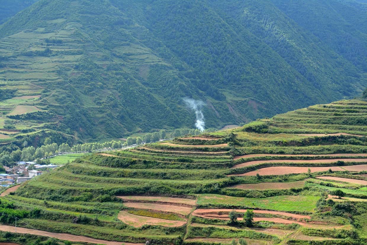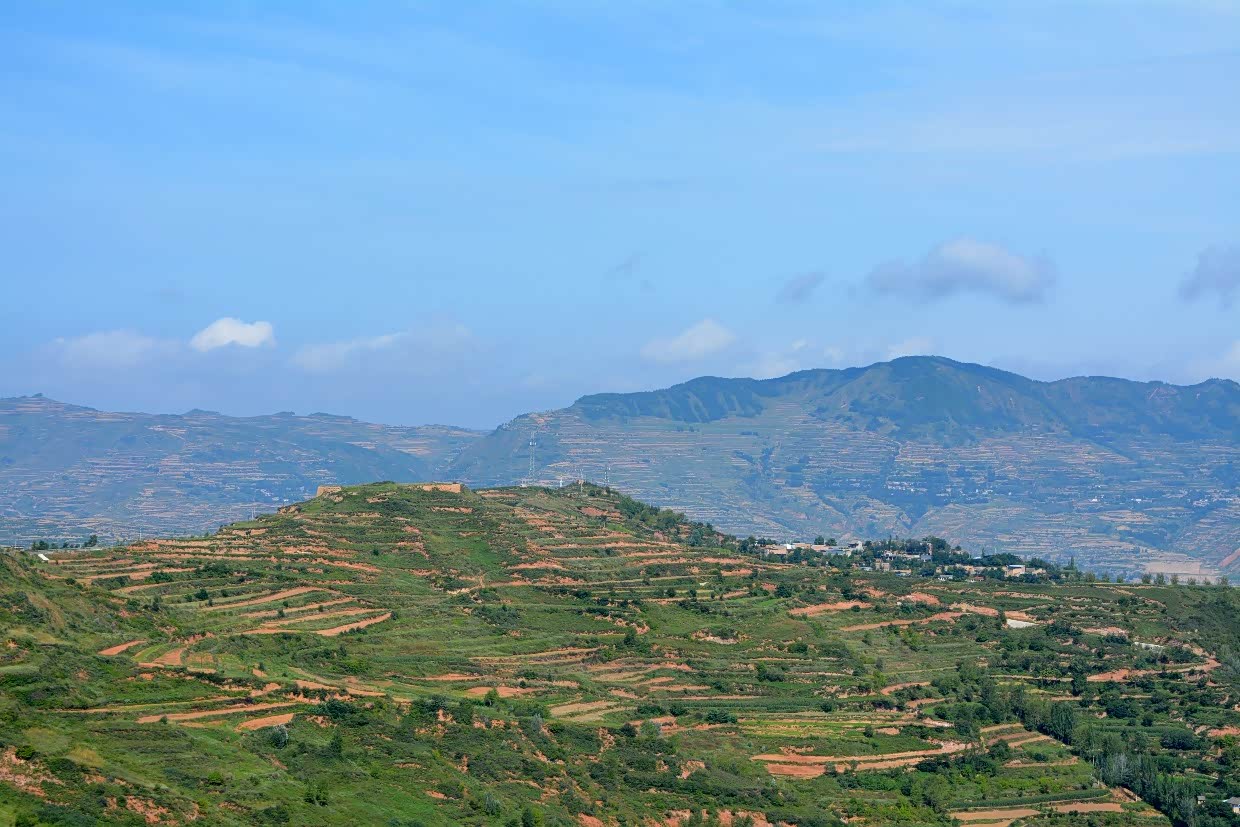 立于平台,放眼望去,片片田地层层叠叠,座座山丘层峦叠嶂。