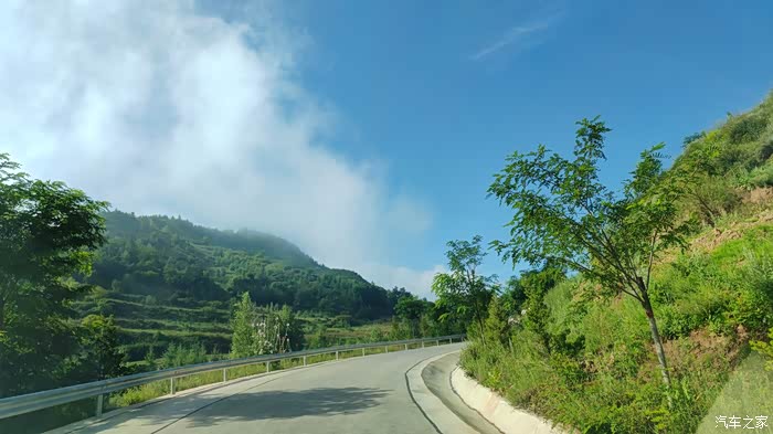 路旁山丘连绵,山上郁郁葱葱,群山绿树映衬着蓝天白云,甚是养眼。
