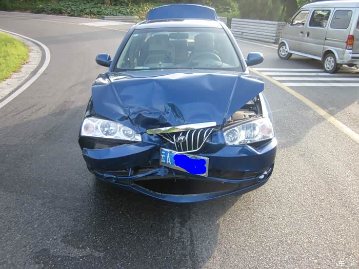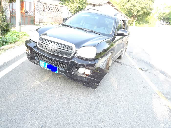 伊兰特最薄弱的中网位置撞上圣达菲左边前保险杠,伊兰特水箱,冷凝器报废,只能拖车背回,圣达菲拆了变形翼子板还能自己开去修理厂
