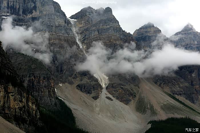 用长焦仔细观察十峰山的山崖,有冰川在山间倾泻