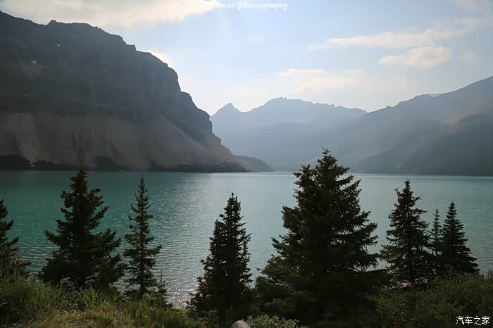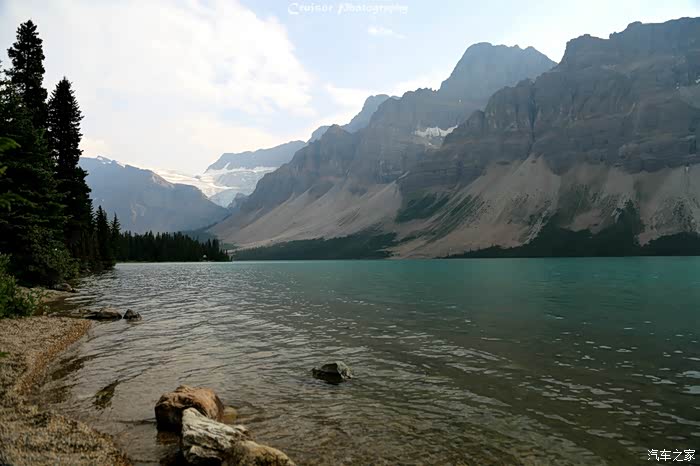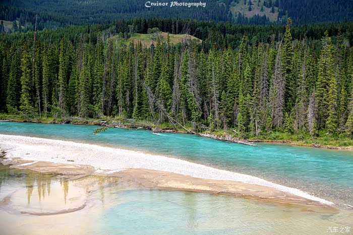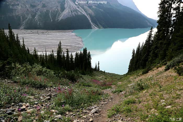 这是路旁经过的Bow Lake,山间的野花开得正艳;弓湖是弓河的发源地,以湖的沿岸长满了宜于制造弓箭的道格拉斯冷杉而得名。弓河沿绵不断,流过班夫小镇和卡尔加里流向遥远的东方,最终流入大西洋。