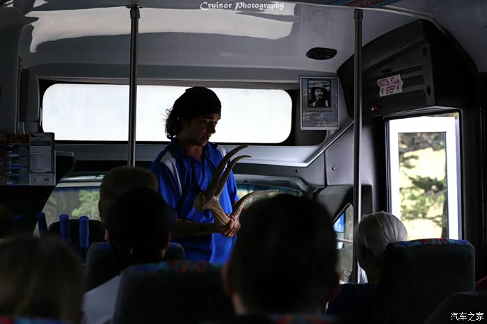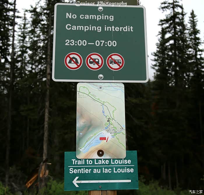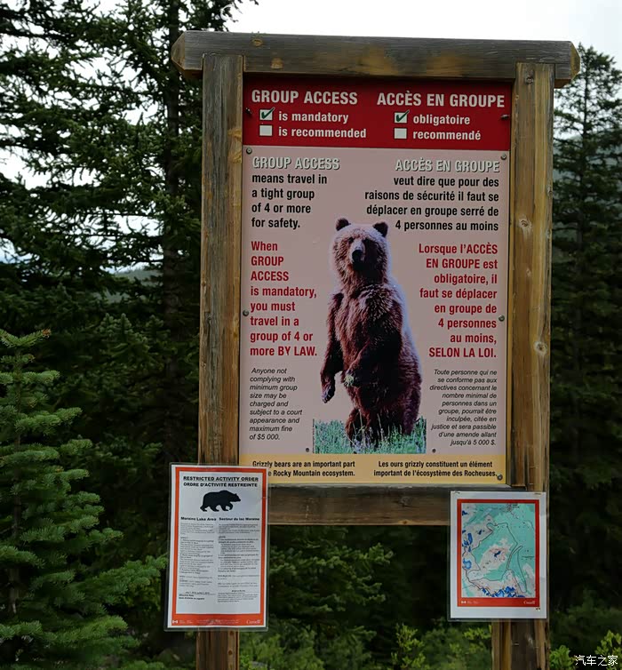 路旁的警示牌,警告游客这里有熊出没注意,要求必须四个人或以上组队才能前行,而且是强制规定