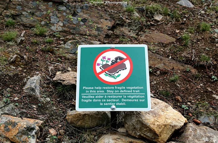 这块警示牌上写着,请帮助恢复这里脆弱的植物环境,只在步道行走