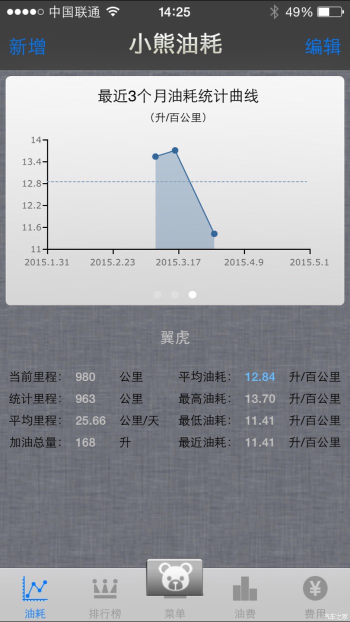 油耗:新车开了1000公里,油耗说是不准,不过还是帖出来给大家个参考吧。其中高速80公里,二环快速路在50-70公里的样子,其余市内,平均速度显示记不清了,只记得十几,行车电脑显示油耗12.5,自己用小熊油耗统计的是12.84,基本上一致。