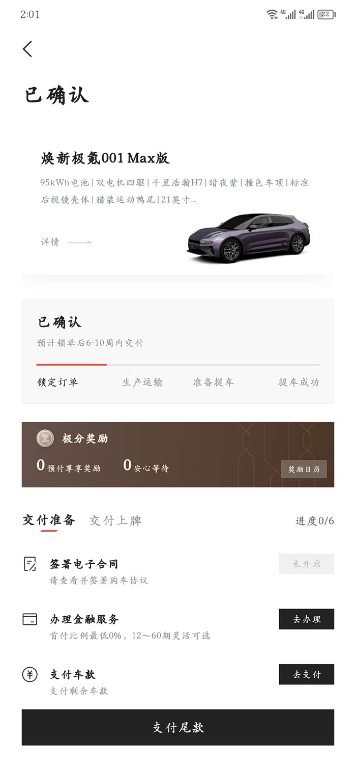 3. 作为11号上市就锁单的,购车时承诺“按锁单顺序排产交付”,但我的订单20.27分锁定满4周仍未排产,不少在我之后锁单的车主却提前提车。而且最近极氪推新政策,广州,上海车展下定用户送极分及1000度电卡,早定的没权益权益,背刺已成传统。