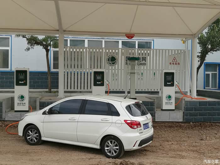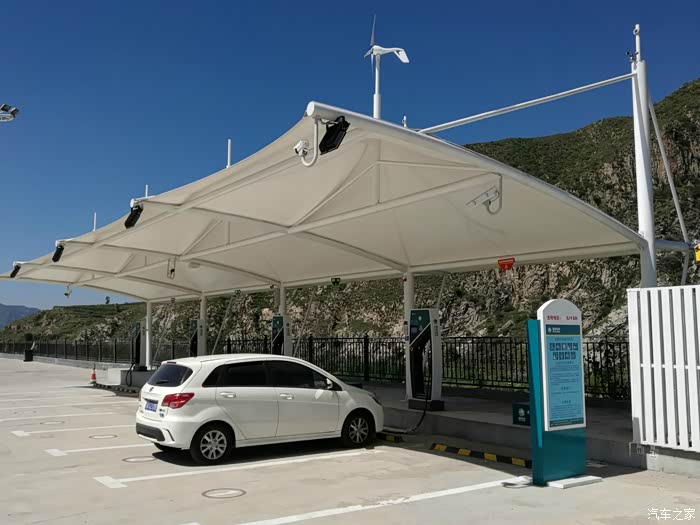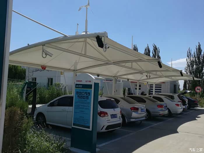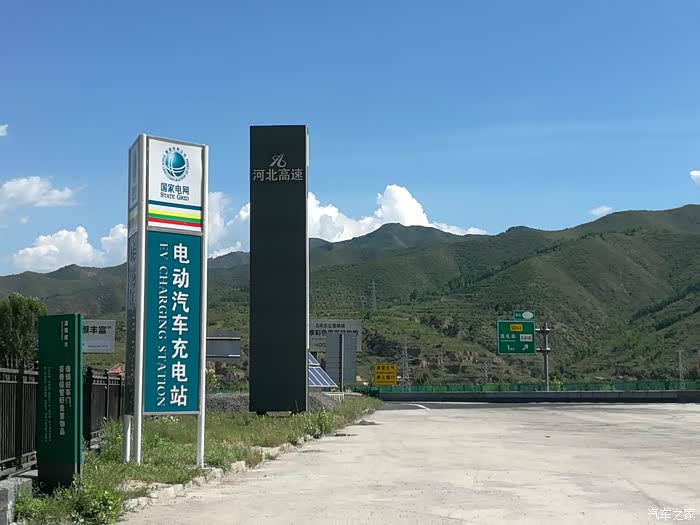 2016年8月29日上午9:00出发,满电,续航161KM。计划走天路东段,西(野狐岭)进东(桦皮岭)出,进入天路前准备充电两次,充电地点分别是官厅服务区和张家口服务区。打开高德地图,将重点设为张家口服务区,将官厅服务区设为经停点。北京到到张家口服务区188.5KM,中间须补一次电,99.8KM处的官厅服务区比较合适。一路无话,因为是周一,所以车不是很多,一路通畅。八达岭一带稍拥堵,上坡路段,百公里耗电18多一些。出京后,景色渐变,到官厅水库附近,出现了大风车等景观。2个多小时后,到达官厅服务区,充电区就在入口附近,很好找。充了大概四十分钟左右,没有充满,但是已经足够用了,于是结算走人。