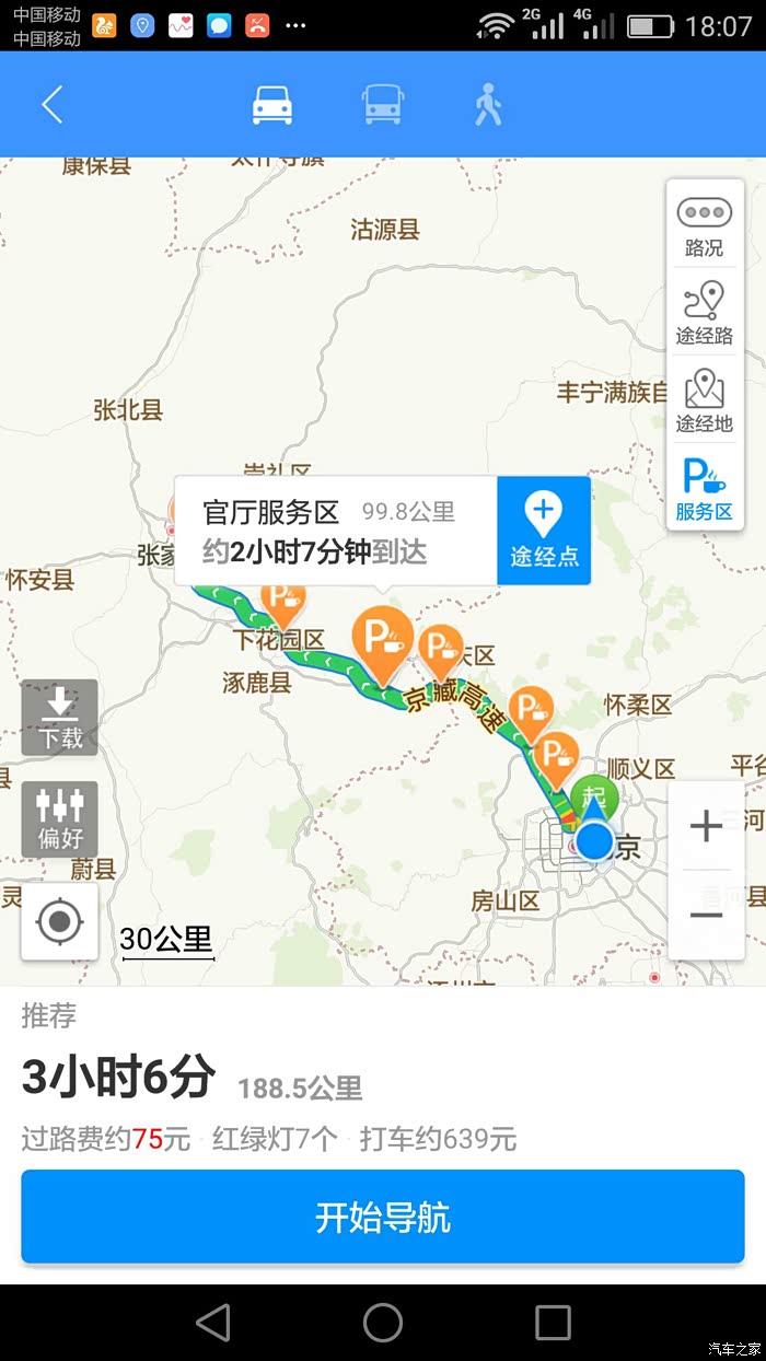 6、行驶约50KM至崇礼服务区,续航60KM。补电约40分钟,续航120KM。设置导航为下花园服务区。