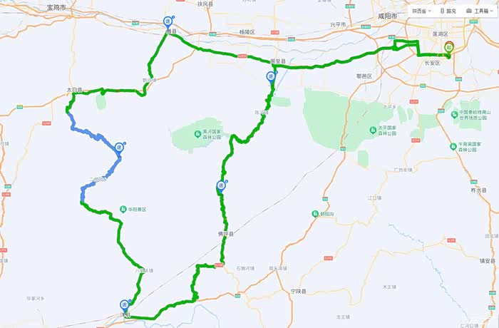 西安——河堤路——眉县——斜谷——太白县——太洋公路——黄柏塬——华阳镇——洋县——佛坪——108国道——周至马召——环山路——西安