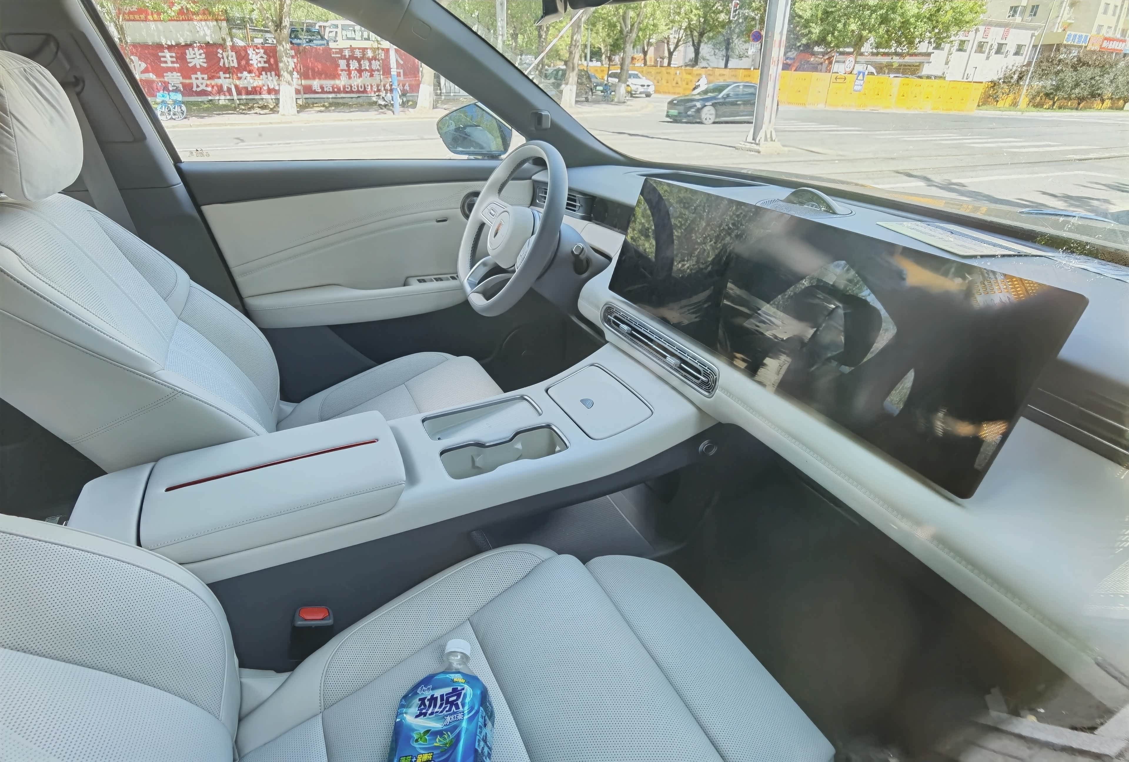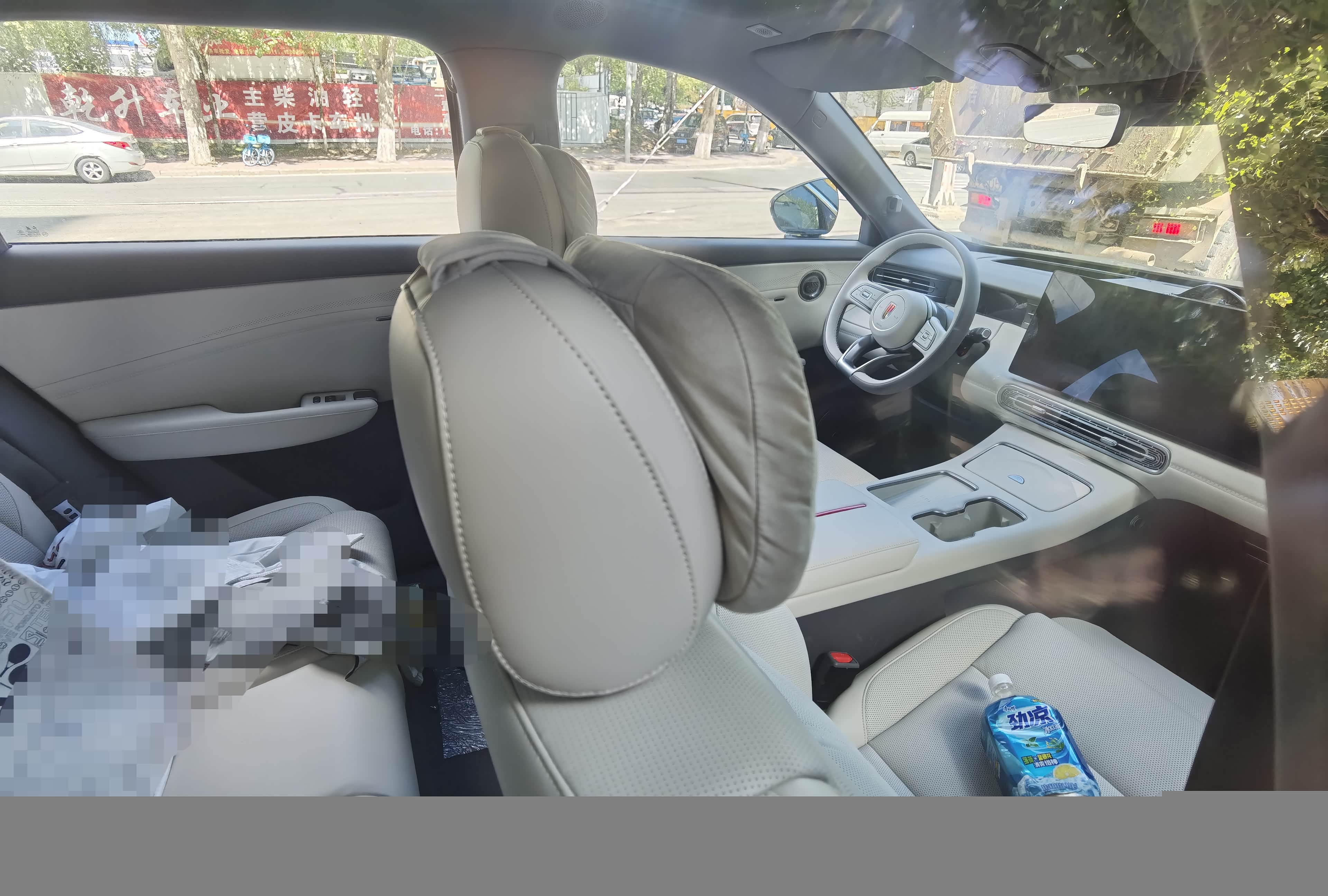 接下来看看内饰,内饰我还是很喜欢的,首先!!!就是前排的大联屏,我还是很喜欢车内有大屏幕的,这样长途旅行坐在旁边的副驾也可以看看视频放松放松,这款车的中控屏绝对够用了,而且中控屏后方还有个类似AI的互动装置,下方写着“红旗”两个字,应该是红旗自己的智能助手,并且每次唤醒应该还有灯光效果,作为红旗第一款配备的,还是挺期待效果怎么样,主驾驶前方还是配备抬头显示,看抬头显示面积更大了,显示信息应该更全面了,也许会有黑科技(很期待),方向盘的配色是双拼,到时候就看各位车主选择什么颜色的内饰了,方向盘的按键也很简约,看样子应该是按压式的,更有触控感,方向盘后面的显示屏变小了,应该是更多的信息可以在抬头显示中查看,中间有镂空的空间,可以放一些随身物品,增加了储物空间,并且配有无线充电,白色内饰搭配中间银色出风口,还是很有高级感的,并且中间扶手箱的红色标志尤其突出,设计简约很高级;车门上的开门把手放在了下方,更顺手了,车门上有个银色装饰,不知道是装饰还是另一种开门方式,还是其他功能,等有机会试驾可以试一试。副驾驶有腿托,应该是带零重力座椅,毕竟已经是现在造车的标配了。