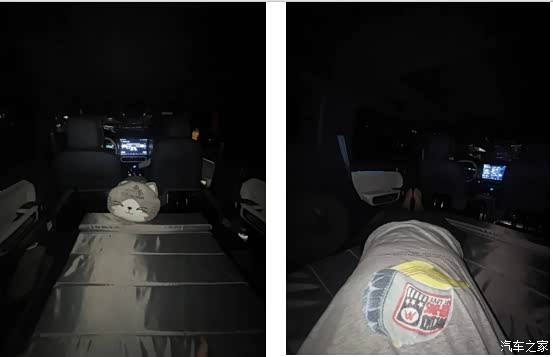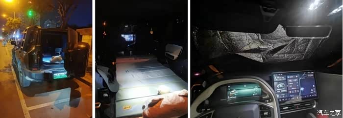 前排放好遮阳挡,关闭车外灯光,把后备厢的一箱水和收纳箱搬到副驾驶座上,后排放平,展开铺上垫子,就算一切就绪。