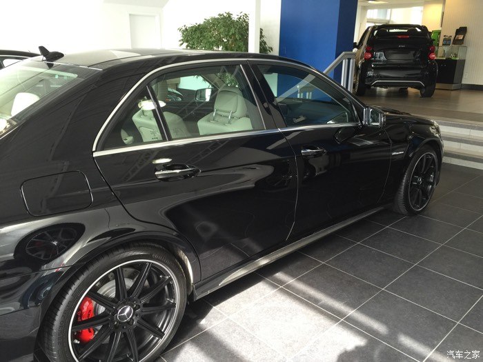 预约了这边的dealer看车,到店里销售才告知e63 wagon没车看不了,只能在电脑上给我看配置选车。我就算再喜欢一个车型,没看到实车,真心也定不下来啊!那会儿就犹豫了,正好门口有辆e63 sedan 就是轿车版,配置惊人啊,灰外橙内,全车碳纤维套件,哑光10幅轮毂(不好意思,我竟然看得入迷却忘了拍照。)我老婆对它连连称赞,要不干脆就轿车?遂要求试驾轿车版!诶哟我去,这辆车正好就是试驾车!这么好的配置拿来当试驾车你舍得么?!(那橙内,官网都没得选,一问果然还是特殊订单。。)试驾的时候,我都没舍得猛操,兴许就是它了呢?不过感受还是要说一下的,AMG的车子,开多就会发现不管大小, 都是一个调调,一个风格。我感觉就像在开我自己那辆507。噢,不,就像开着我自己的车那么顺手。只不过是开在陌生的路面上。说直白些就是我试驾下来没有新鲜感。当然区别还是有的:隔音更好,引擎声和声浪还是很响,但个人觉得声音没507清澈,略显吵闹,有杂音(涡轮的关系?)s加模式下,降档补油的声浪也被盖掉些(隔音?)不过c模式没有507那种憋着劲的感觉,很顺溜很舒适。01号称3.6秒的货,585马力,800n,却没有让人感觉动力上有过剩,也没有任何唐突的推背感,但真得能开得快得飞起而不自知。