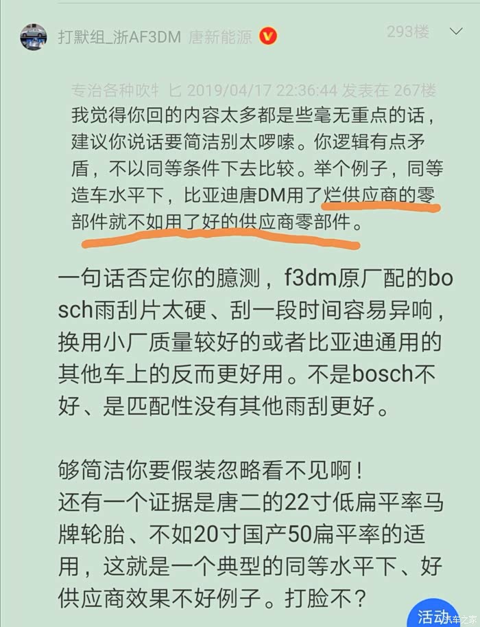 一句话否定你的臆测,f3dm原厂配的bosch雨刮片太硬、刮一段时间容易异响,换用小厂质量较好的或者比亚迪通用的其他车上的反而更好用。不是bosch不好、是匹配性没有其他雨刮更好。够简洁你要假装忽略看不见啊!还有一个证据是唐二的22寸低扁平率马牌轮胎、不如20寸国产50扁平率的适用,这就是一个典型的同等水平下、好供应商效果不好例子。打脸不?
