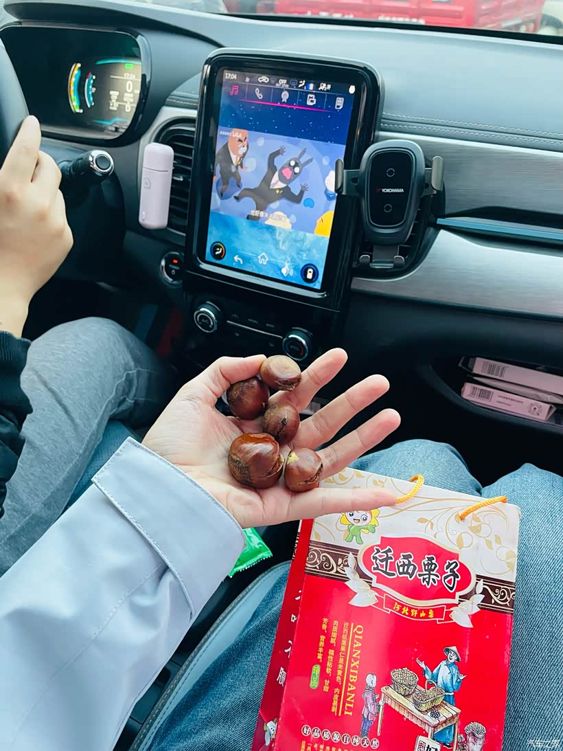 回来的路上看到有卖糖炒栗子的,闻起来非常香,就买了一包,热腾腾吃起来味道也很好。我用U盘给孩子下载了一些动画片和科普视频,这样在路上的时候她也不会觉得无聊了。小蚂蚁的这个大屏幕还是非常不错的,也很清晰。