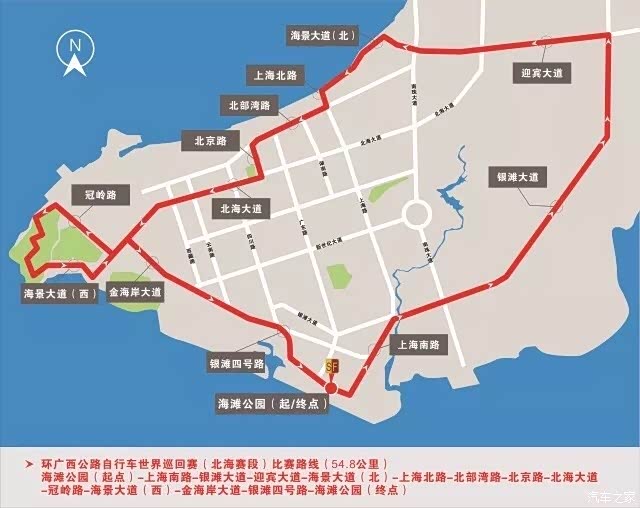 比赛线路:海滩公园(起点)-银滩大道-迎宾大道-海景大道-北部湾东路-北海大道-冠岭路-金海岸大道-海滩公园(终点)。单圈54.8公里*2圈=109.6公里。 有中外300余家媒体聚焦北海对赛事全程全球报道。今天北海赢得世界的关注。