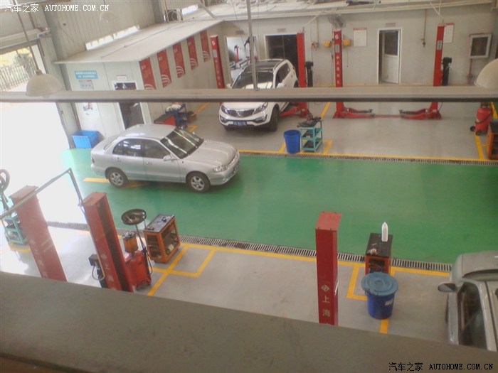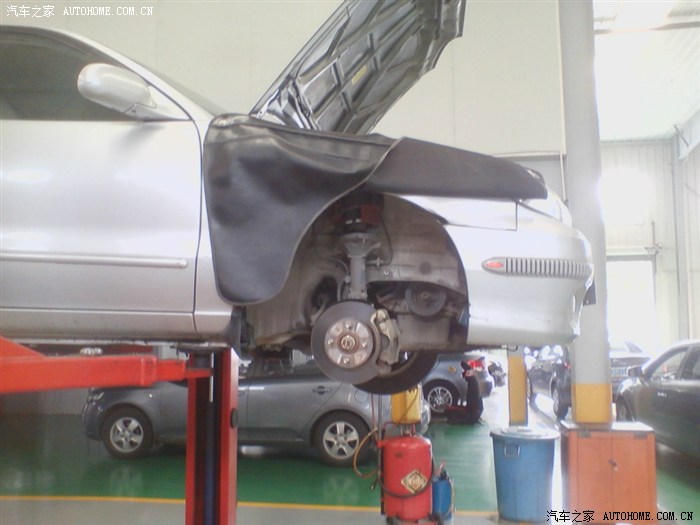 为便于施工,维修工拆了右前轮,用升降机升起了车车。从后面的施工过程看,这的确比较方便的,不需要拆发动机支架。