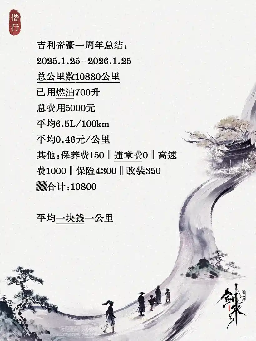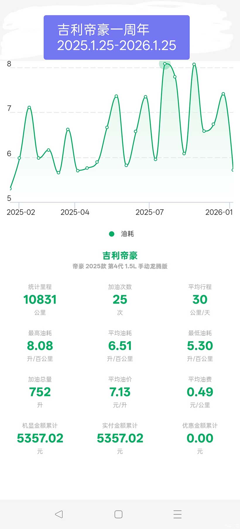 吉利帝豪一周年2025.1.25-2026.1.25总结: