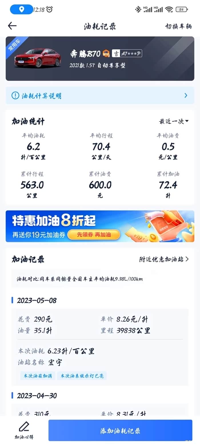 加油我没有选择在石油石化的大加油站,而且选择了当地的一家连锁加油站,充值一般可以有百分之十的优惠,这样算下来我目前的油耗折合为8.45*6.5/100*0.9=0.5元/公里。