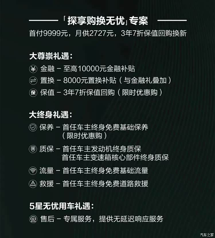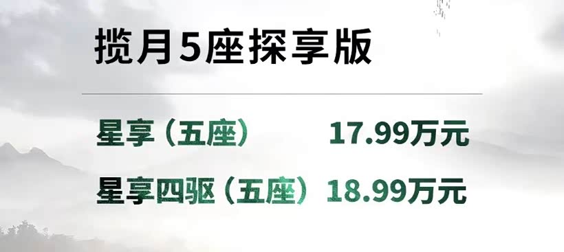 5月16日晚,星途揽月五座探享版正式上市,新车共有两款车型,其中星享版售价17.99万、星享四驱版18.99万,和售价一同公布的还有相关优惠政策,主要包括至高10000元的金融补贴、三年七折保值回购以及首任车主发动机终身质保等,具体如图。