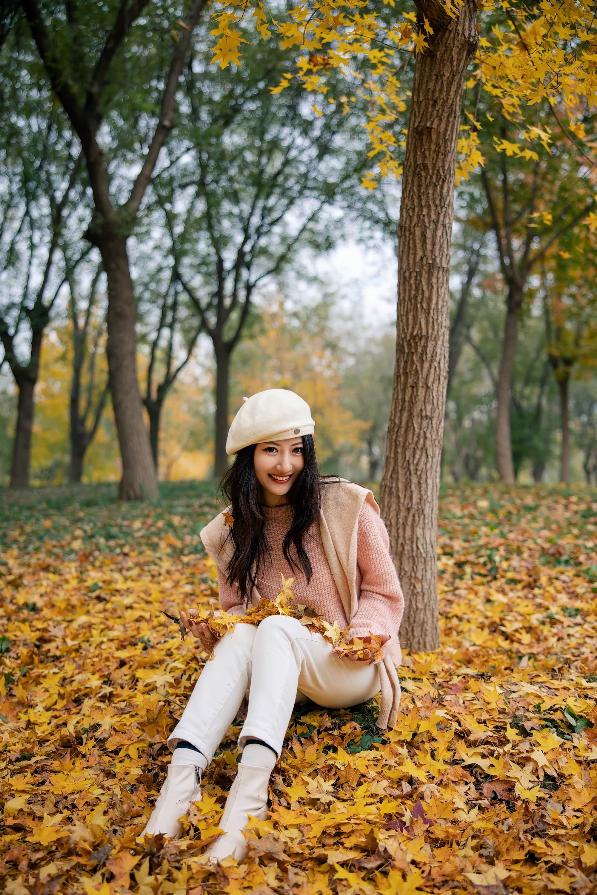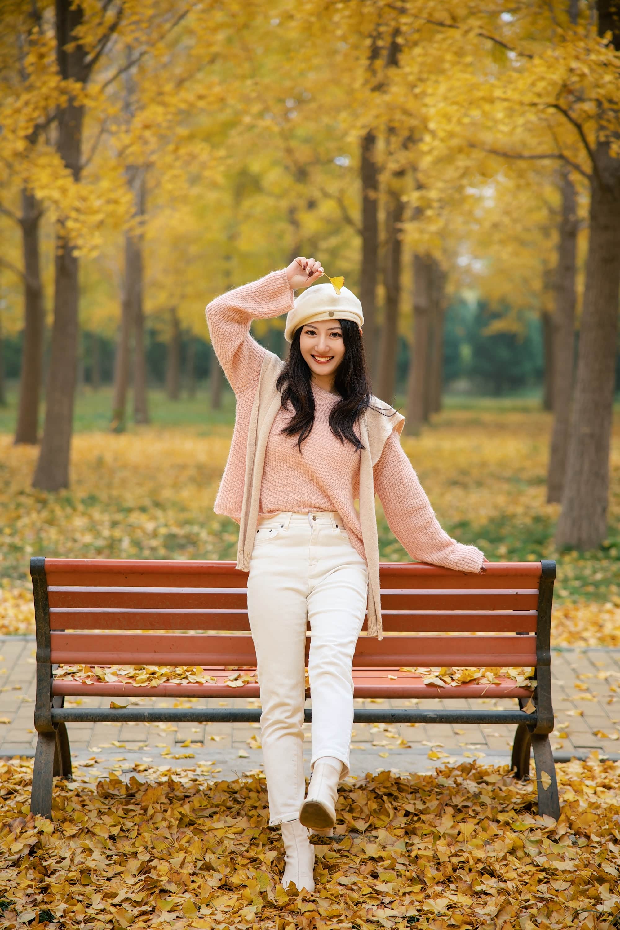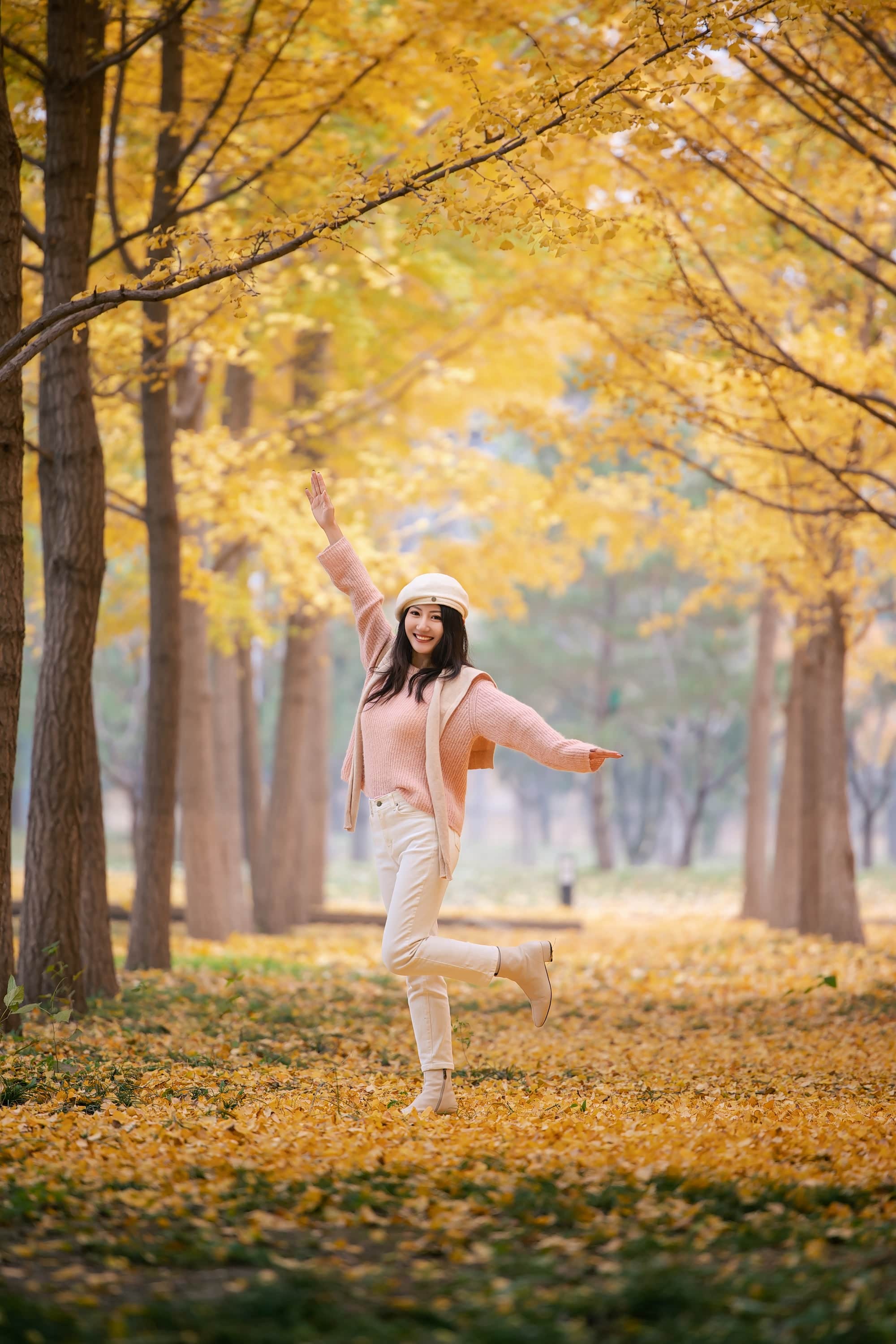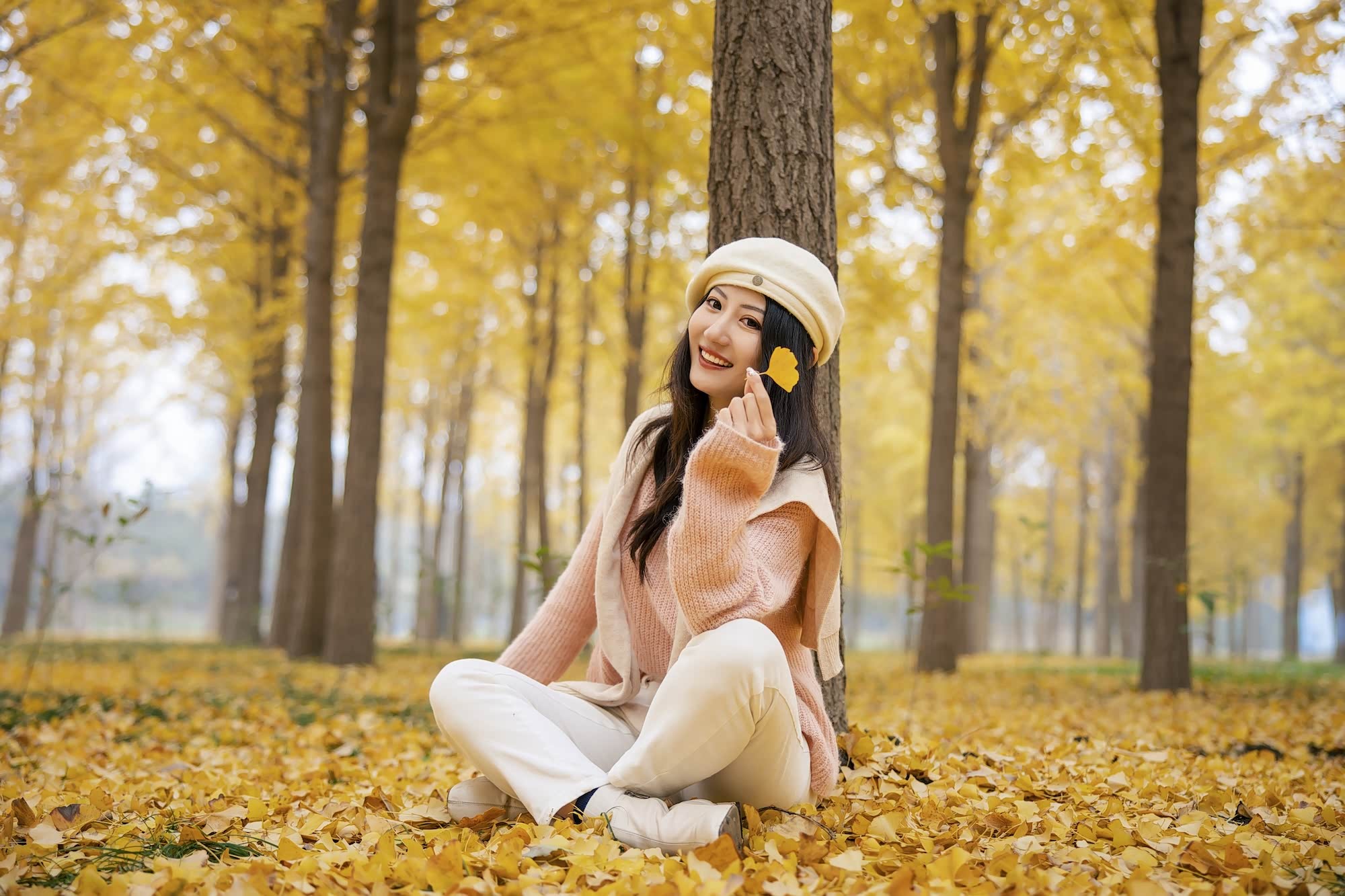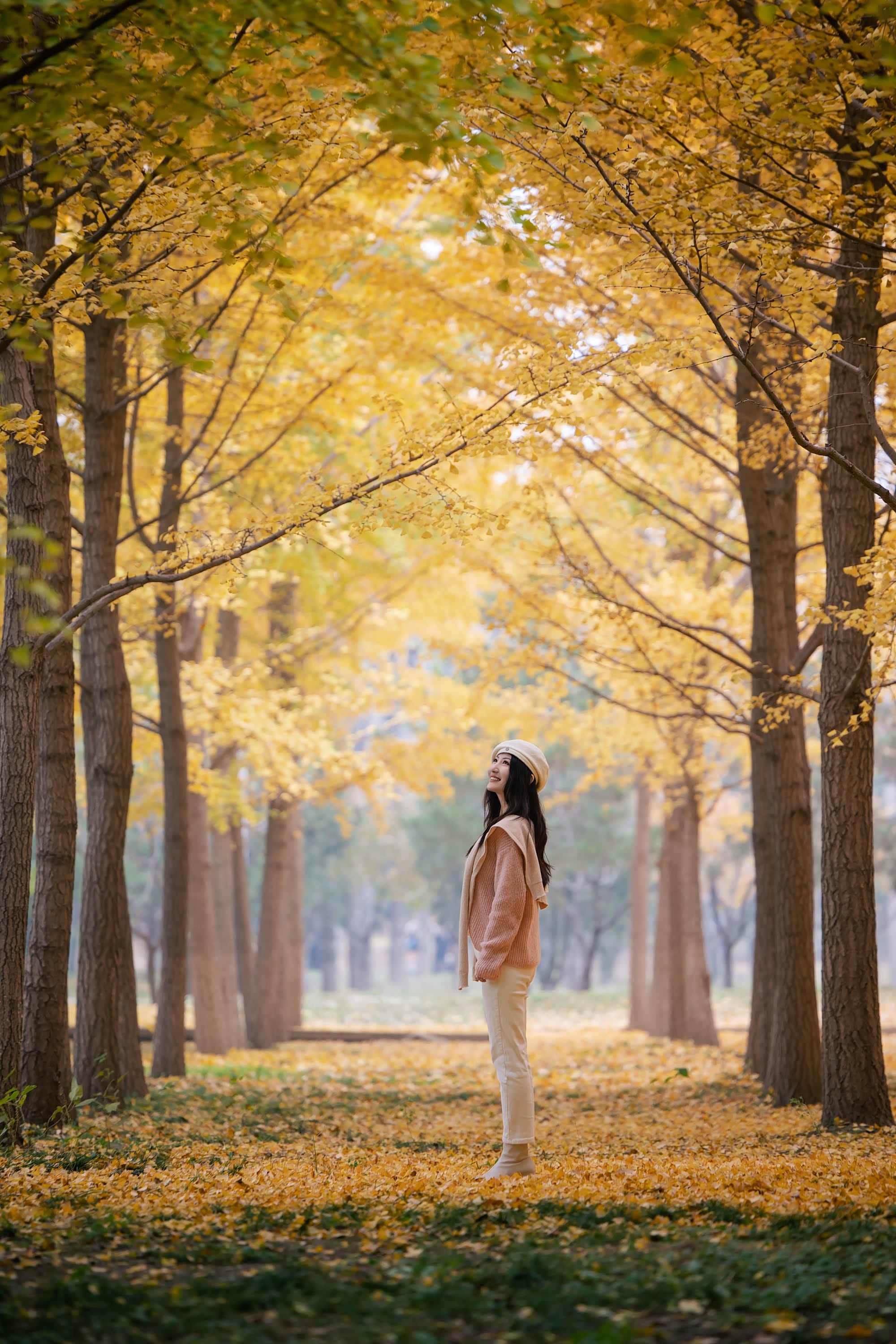 这时候来拍照,真的太合适了。光线特别柔和,小姐姐随便站在哪儿,背景都是一大片浓郁的金色,特别梦幻。拍照姿势也不用愁,自然地走一走;或者弯腰捡起一片漂亮的叶子对着镜头笑笑;再不然就靠在树干上或者坐在厚厚的落叶上,怎么拍都好看。