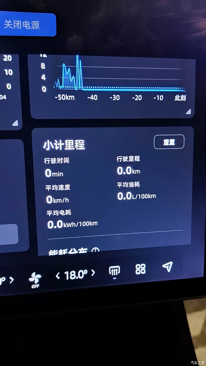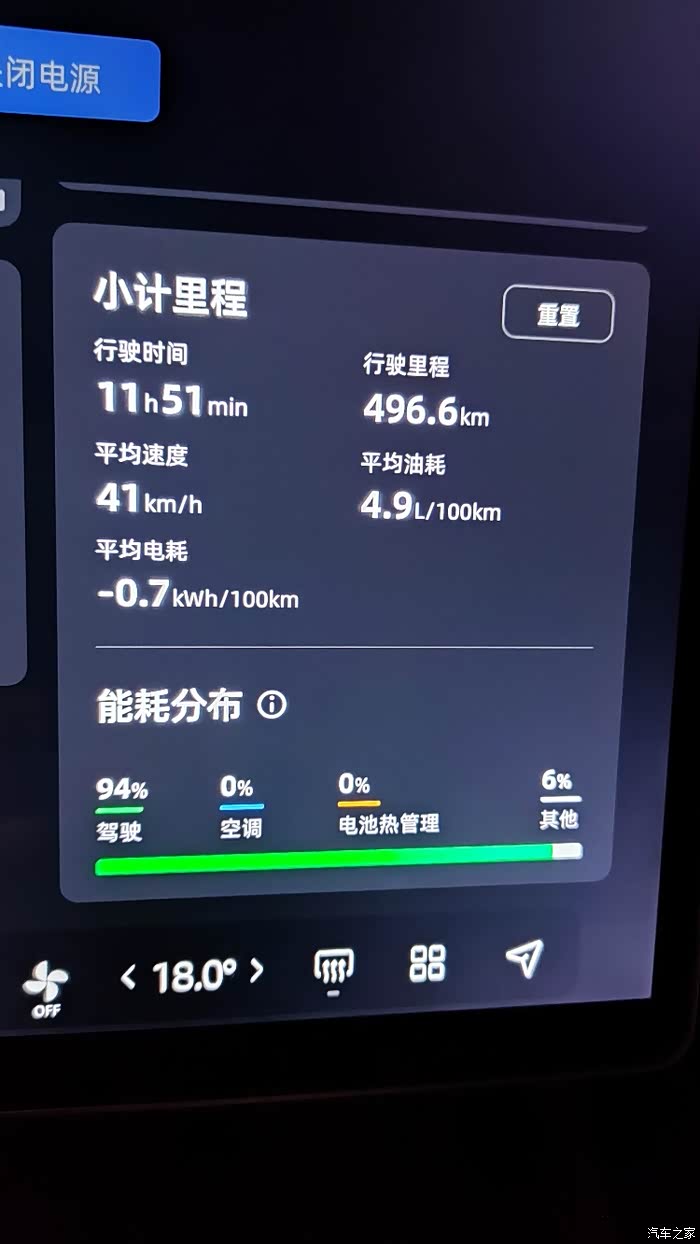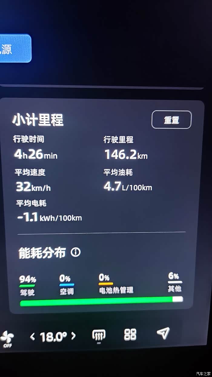 加满油,用纯电模式将纯电里程跑光,一直到发动机强制启动车机自动切换为智能模式为止。此时将小计里程重置清零。(这里有一点需要说明的是测试开始前一天我是空电加满油跑回家充电的,行驶里程为5KM,当天并没有想到做这个测试,后面知道出行计划才临时起意,所以这5KM全部使用的燃油,最后计算油耗时需要在小计里程中加上5KM)。