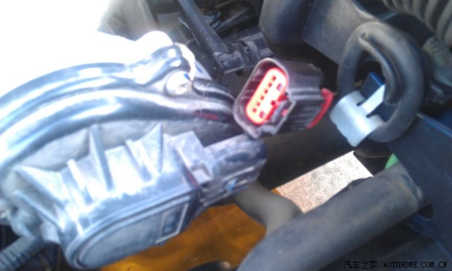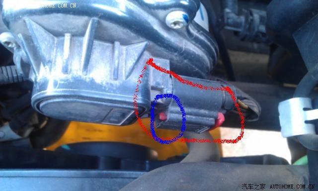 这个需要拆四个螺丝 需要套筒 而且是可以转弯的套筒 因为空间比较短。对了 如果你不想拆 可以在这个时候直接洗 用手推开阀门片就可以。不过我觉得还是拆下安全些吧 拆螺丝之前 先拔下节气门的插头 这个要注意。你注意看 右侧有个红色的插销 需要把它拔出来 但是你一般拔不动 经过我的研究,需要先把左侧那个小小的红色卡子用手挑起来 就可以拔动大的红色插销了。蓝色的那么有个小卡子,。