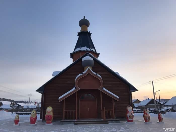 没想到原始古朴村落里面有这么一个教堂,教堂门口两边排列着几个 俄罗斯 套娃。教堂是北红村最豪华的建筑,带有 俄罗斯 建筑风格。