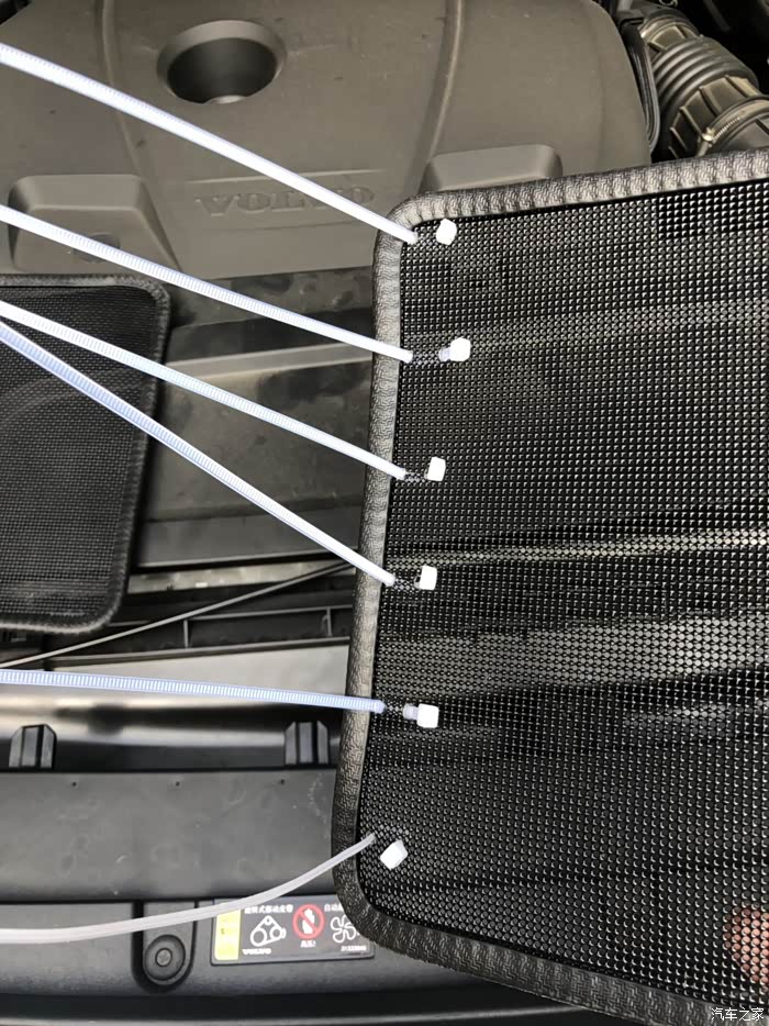 仔细量好尺寸,把网分成四片,封好边条,防止扎手。上下各两片,注意左右两片的尺寸不完全一样,长度稍有区别,也就是说沃尔沃的标志圆箭头不是在正中心哦