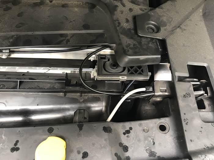 于是打开发动机舱盖先了解一下结构再做决定,拆了几个膨胀卡扣,发现挺好拆嘛,而且只要拆掉一个正中间的盖板,手臂就可以伸入到冷凝片前方,这个位置的空隙完全可以容得下手动操作。