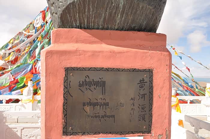 黄河源头纪念碑,碑面刻有十世班禅大师1988年和胡耀邦1984年分别为牛头碑题写的藏汉文“黄河源头”四个大字,黄铜黑字,遒劲大方。