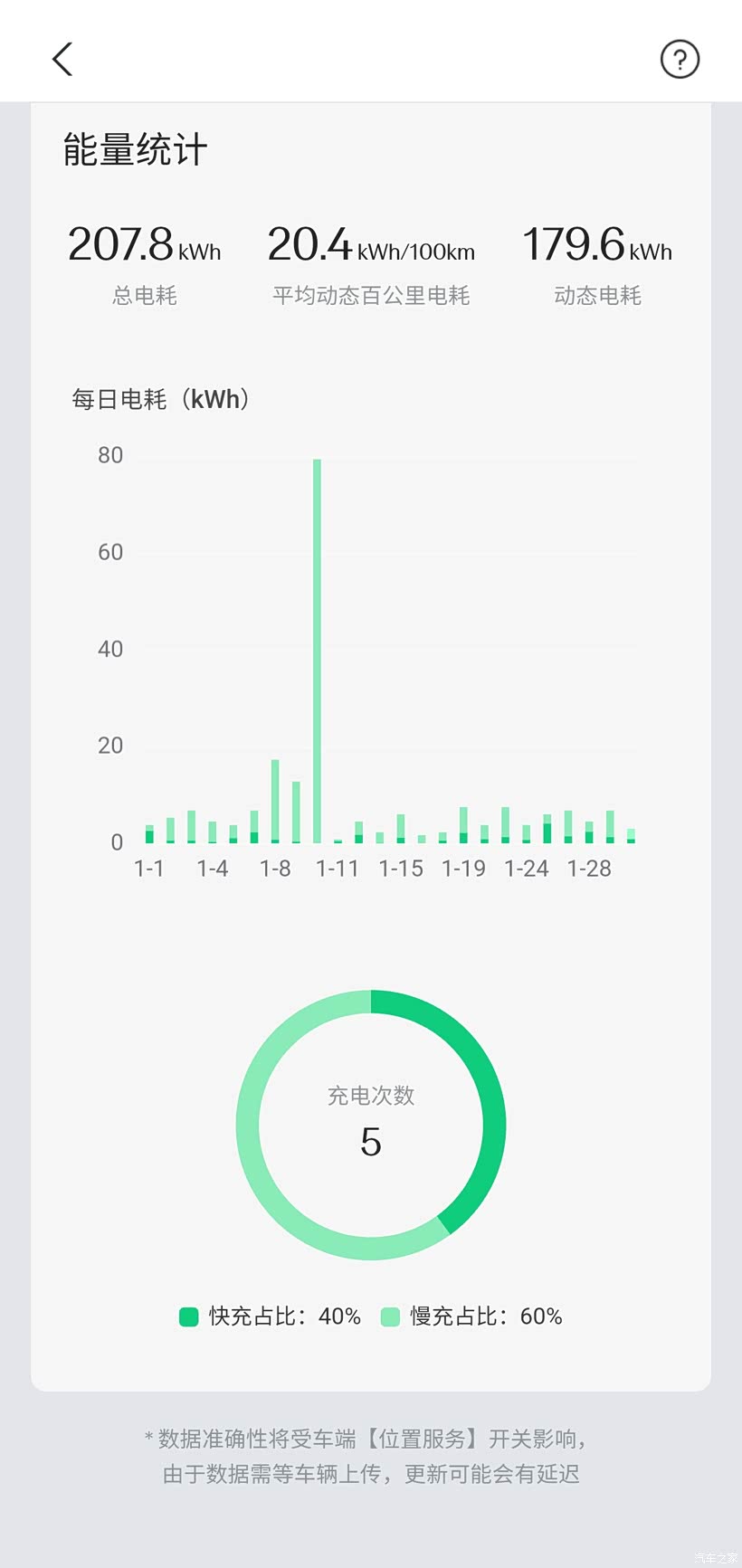 我这里属于南方,冬天温度一般在0-8°之间,不是那种特别冷的。我动力是标准模式,早上开车有点堵,但是也还行,7公里25分钟。一般开空调23.5°,风扇3档,只开前排吹脚,无其他功能,耗电在32kwh/百公里;开方向盘加热,电耗39kwh/百公里。后面我有点不敢使用了,为了省电,控制了一下空调,只开吹脚,后排不开,风挡3。