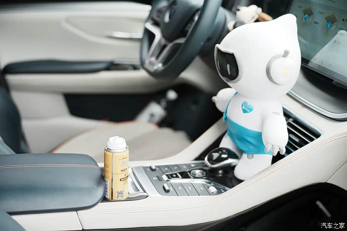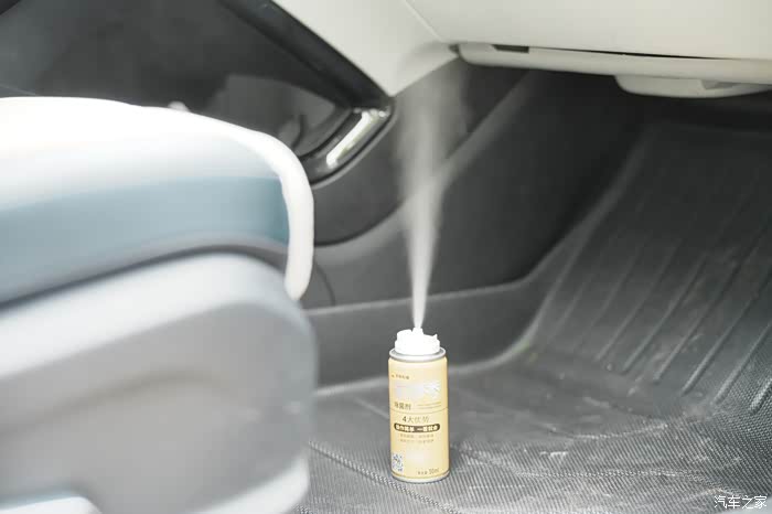 然后将除菌剂放在副驾脚部位置,将除菌剂瓶子上的卡扣按到底。
