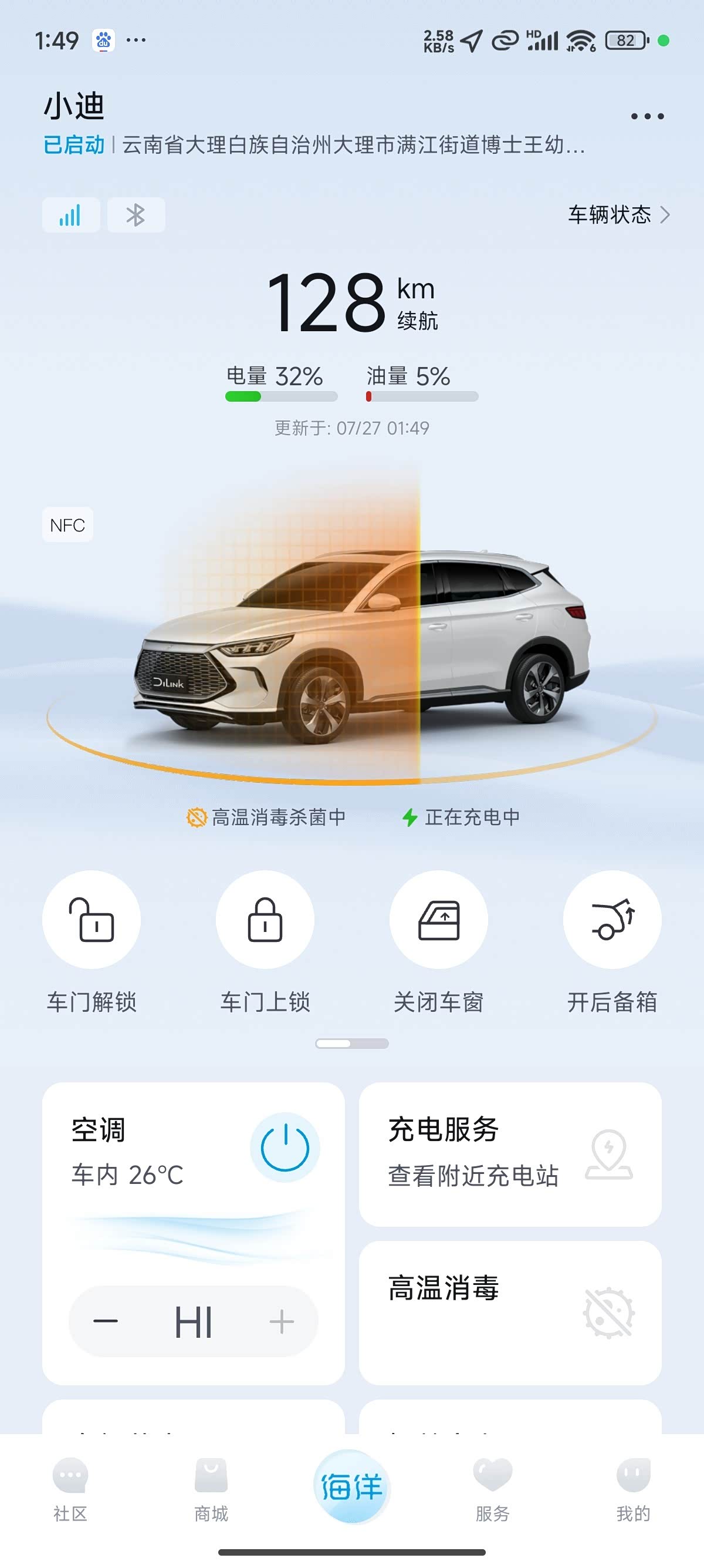 进入到App,打开车辆控制界面,点按“高温消毒”功能。