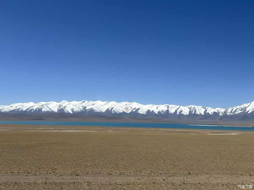改则县到民丰县的216国道途中的昆仑上的雪峰群和底下的碧蓝色湖泊,风大,浪也大