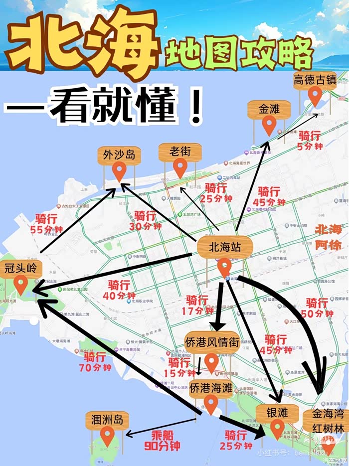 按照下面这个图挨个逛就可以了。涠洲岛的船票比较难抢,购买界面每次还得输入乘船人,比较麻烦。