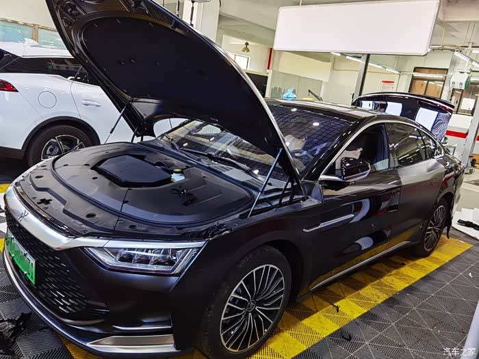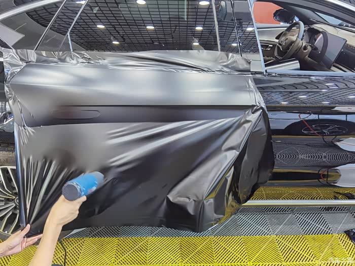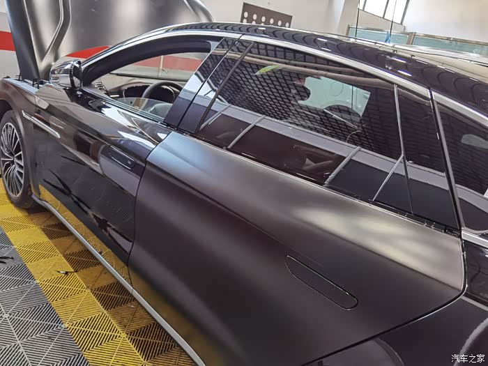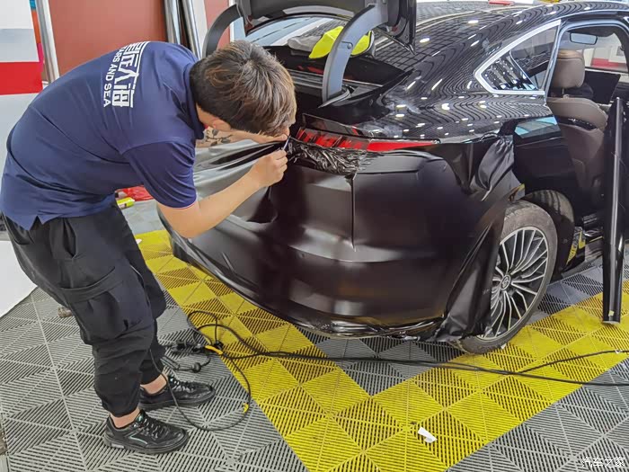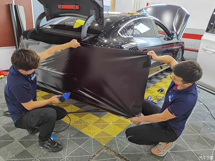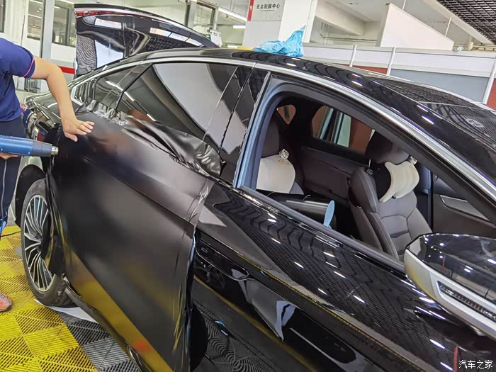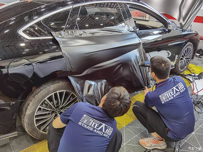 前几日在路上同遇一辆汉,车身贴了深蓝磨砂的颜色,感觉有一股独有的魅力,说实话汉的黑亮车漆太阳下虽然闪眼,也足够霸气但是有些张扬,如果也能搞成暗黑,是否更有味道…于是乎~就有了今天的行动!我一直是一个行动派,心里有了想法就马上电话联系了店里咨询改色事宜,刚好店里有货,虽然是国产的,但是车子都选择国产了,那贴个膜自然也支持国货!开工!