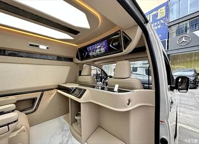 内部采用米色为主色调的设计, 看起来更加舒服。头等舱航空座椅具备通风、加热、腿托等功能,坐上去有一种陷进去的感觉,乘坐舒适性十分高。最后排的三连排电动沙发座椅是一键放的,带来了一个很好的休息区域,第一排座椅可以旋转过来,搭配隐藏小桌板就成为了一个临时的办公会议区域。车内也有着大量氛围灯光的点缀,使车内的豪华性与层次感得到更好的提升。