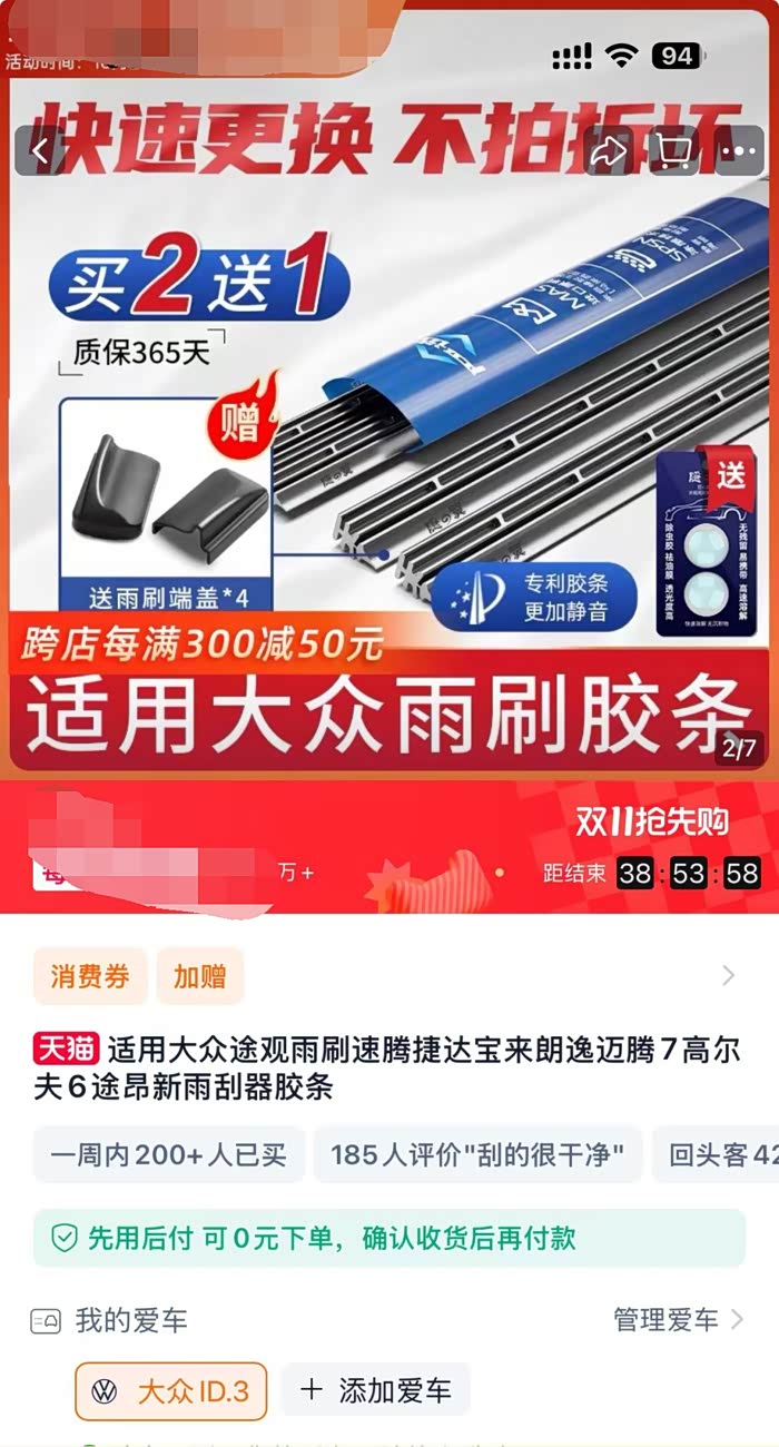 并且由于这个胶条并不贵,某宝上也就买13元一对,并且自己更换也非常简单,不用去外面花钱叫人换。所以性价还是非常不错的。就算后期又有异响了,我们再更换一对新的雨刮器胶条就行了,也是非常方便简单的。总体来说这个雨刮器异响维修解决方案还是挺不错的,如果你的ID3雨刮器也有这样的异响,不妨用我这个方法试试。