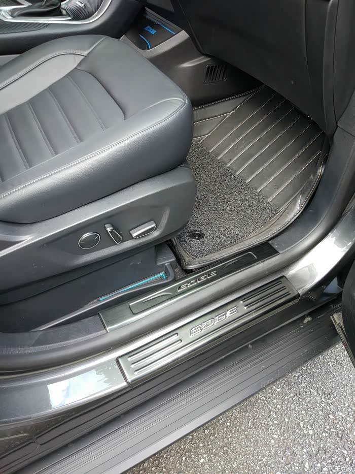 在网上买了一堆东西,全包围真皮+丝圈脚垫、车尾箱垫、侧踏板、钥匙包、门槛条、中控碳纤贴膜、车门防踢膜、门槽垫、屏幕保护膜、车门防擦条、备胎保护套、电动尾门贴、转向轴保护罩、方向盘套、驾驶座凉垫等,没上牌前只能装车内的东西,4S店送的行车记录仪、贴膜、挡泥板也要上牌后再装。