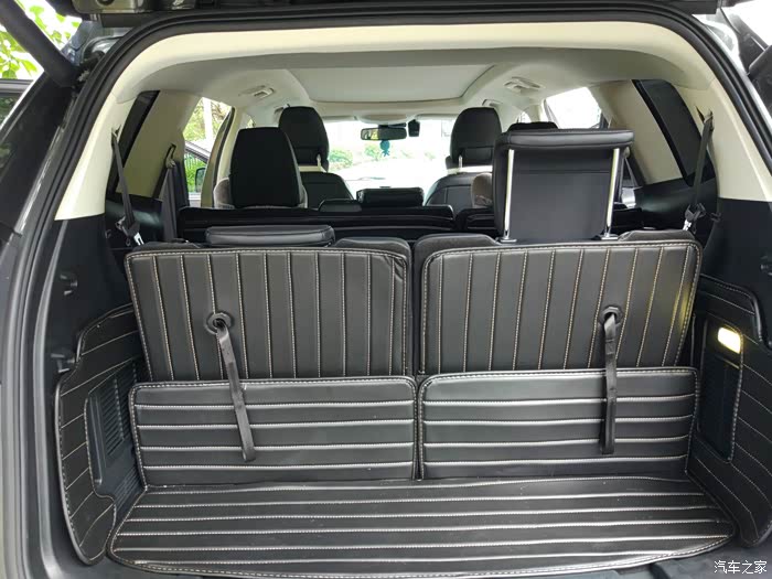 【内饰】中控科技感强,全车内饰为真皮+软塑料+钢琴漆面,够档次,但钢琴漆面很容易刮花,可以通过贴碳纤膜解决;全景天窗很爽,使车内毫无压抑感,大幅提升第二、三排的乘坐感受;加装真皮+丝圈全包围脚垫、尾箱垫、迎宾踏板等后,内饰进一步提升